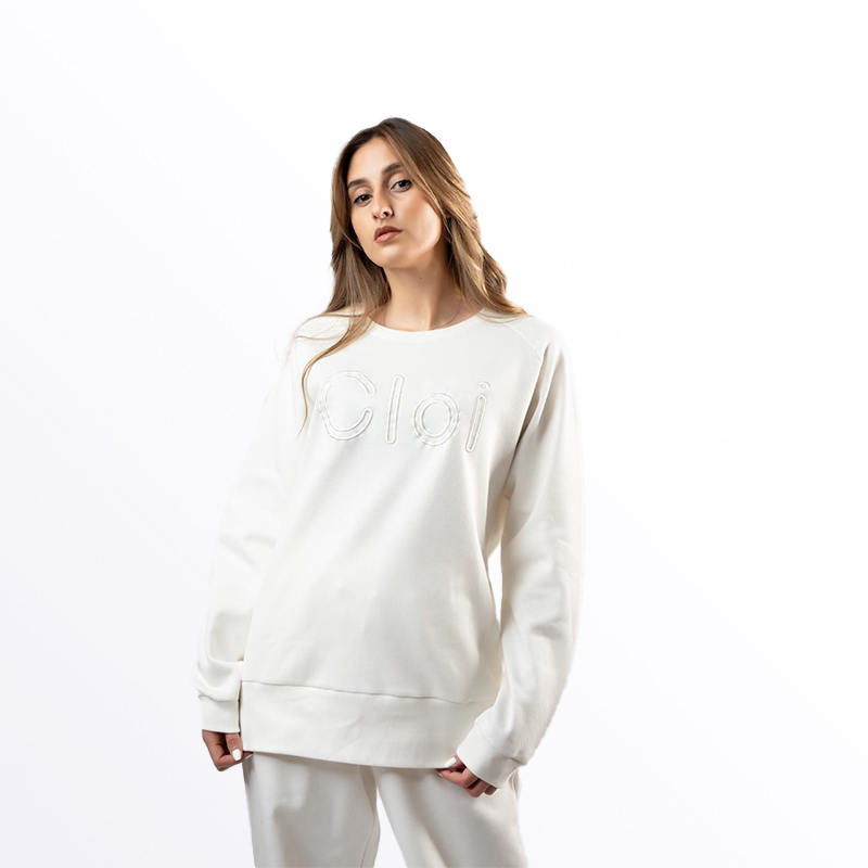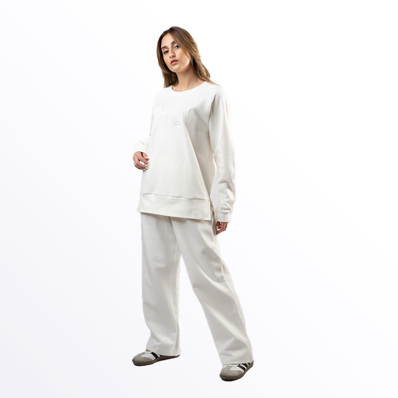 طقم رياضي نسائي بلون موف أنيق، يتكون من كنزة بياقة مستديرة وأكمام طويلة، وبنطال قطني مريح بقصة واسعة. يتوفر الطقم باللونين الأبيض والموف، مما يجعله خيارًا مثاليًا للارتداء اليومي أو لممارسة الرياضة.