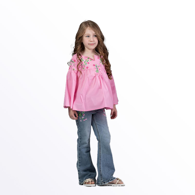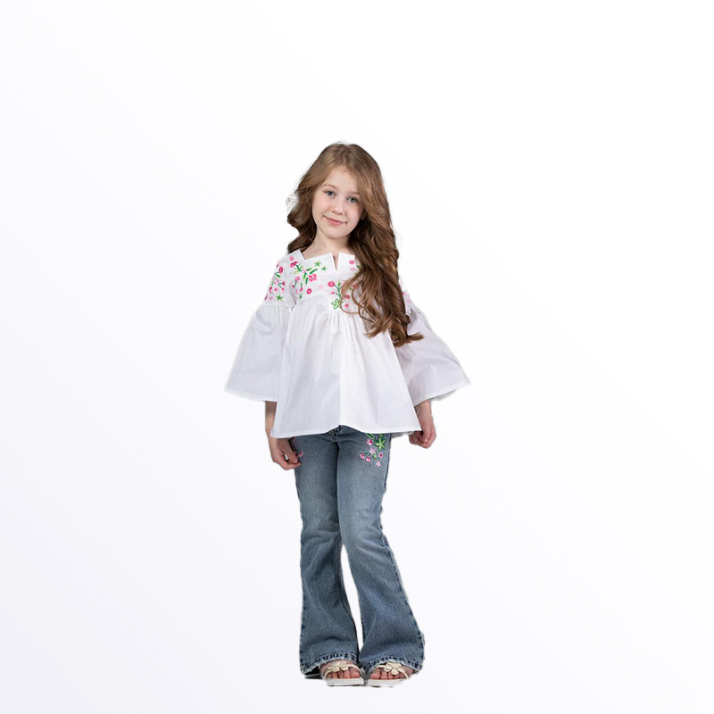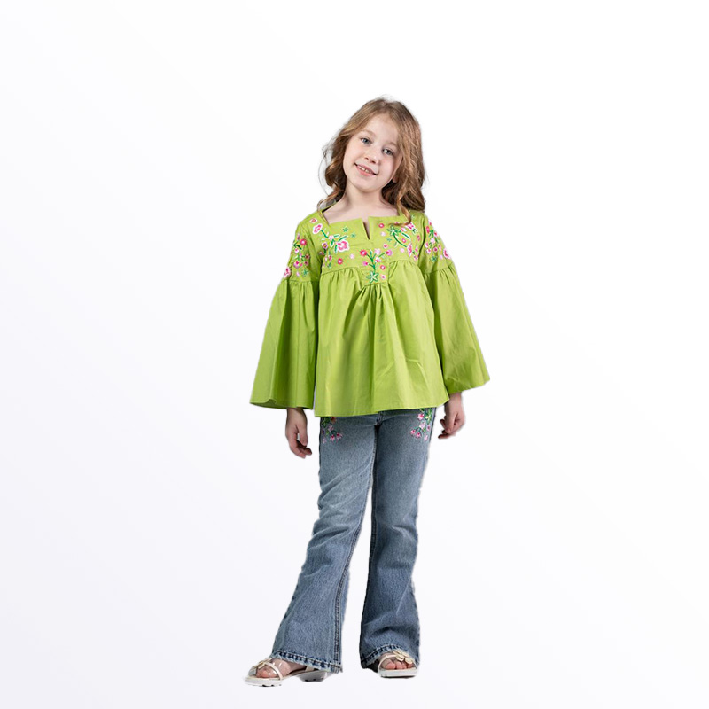 كنزة بناتي بلون كيوي زاهي، تتميز بتطريزات ورود ملونة وأكمام واسعة. تتوفر بألوان صيفية مبهجة تشمل الأبيض، الكيوي، والزهري الفاتح، مما يجعلها قطعة أنيقة ومريحة للإطلالات اليومية.