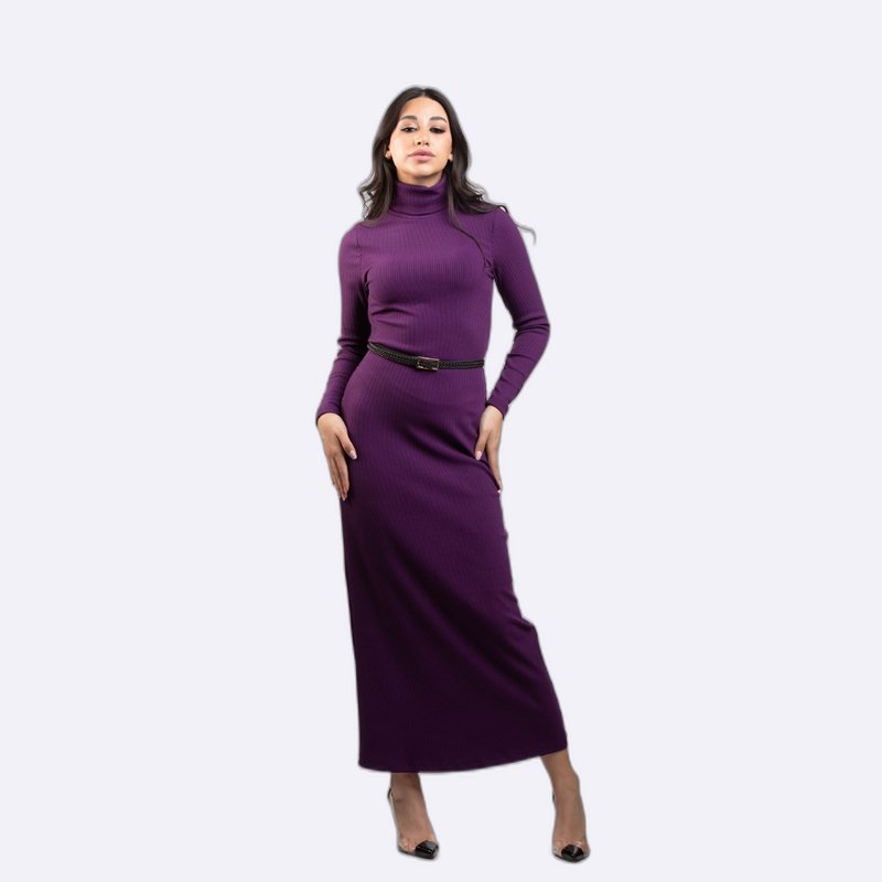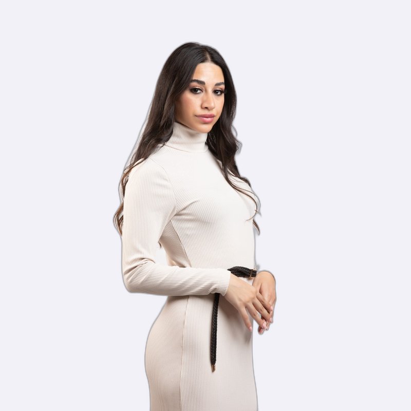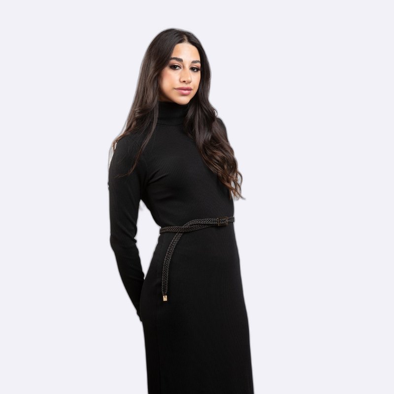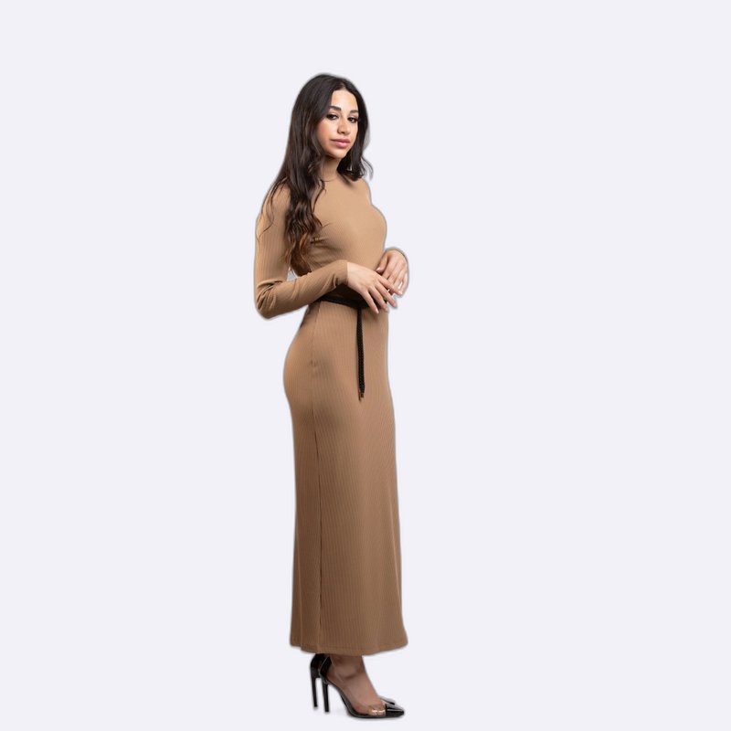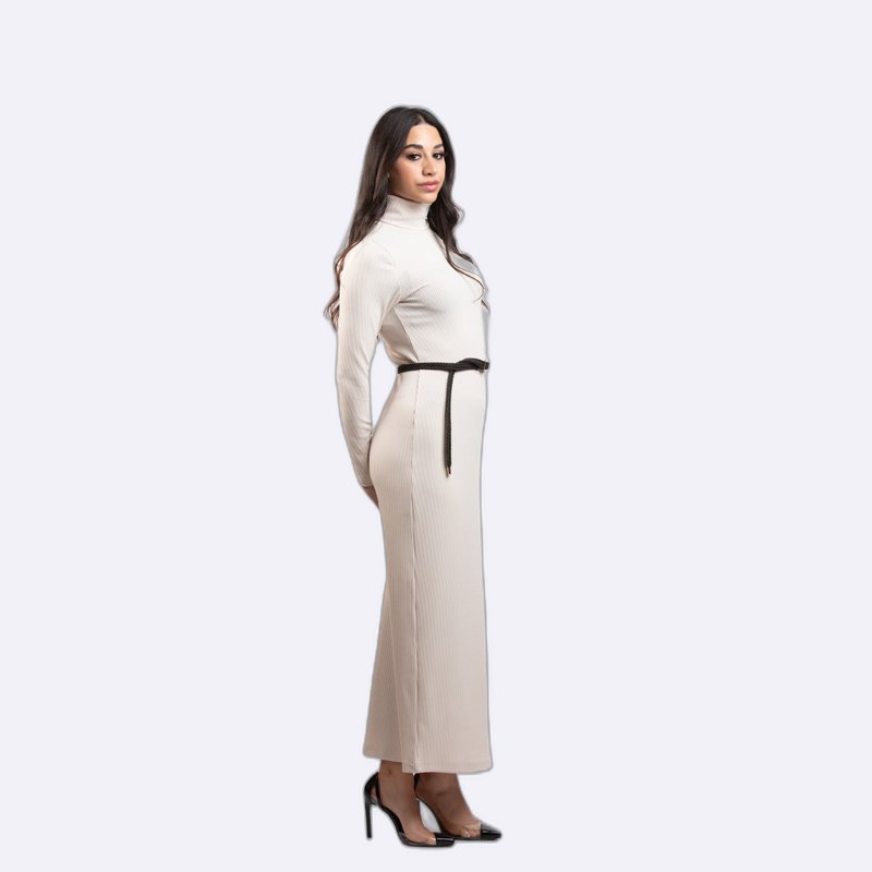 فستان طويل بقصة ماكسي أنيقة ومضلعة (Ribbed)، بياقة عالية وحزام رفيع على الخصر.