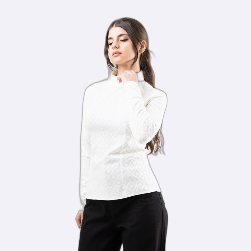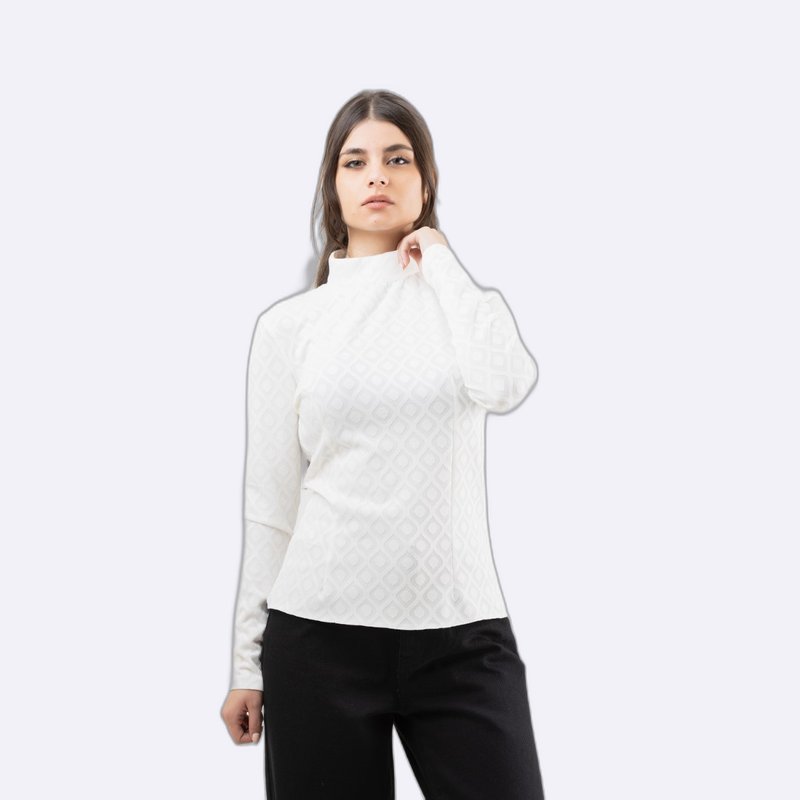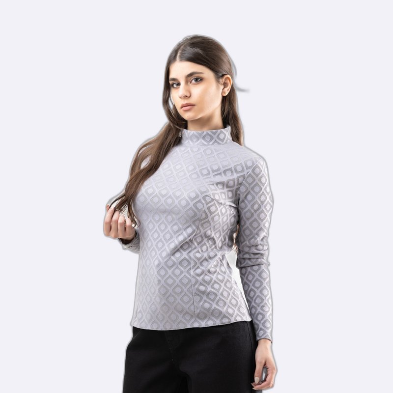 بلوزة بقصة ضيقة وأكمام طويلة، تتميز بنسيج الجاكار المطبوع بنقشة هندسية وبياقة مرتفعة وهمية.