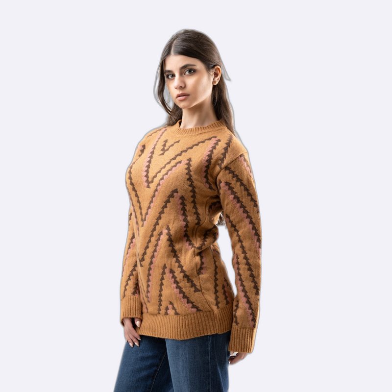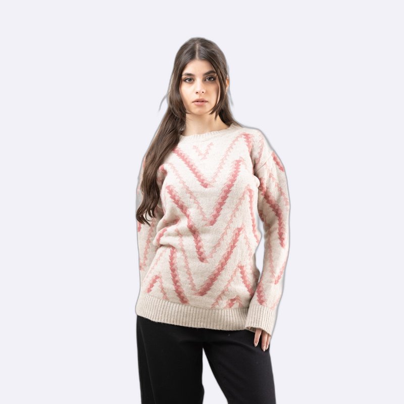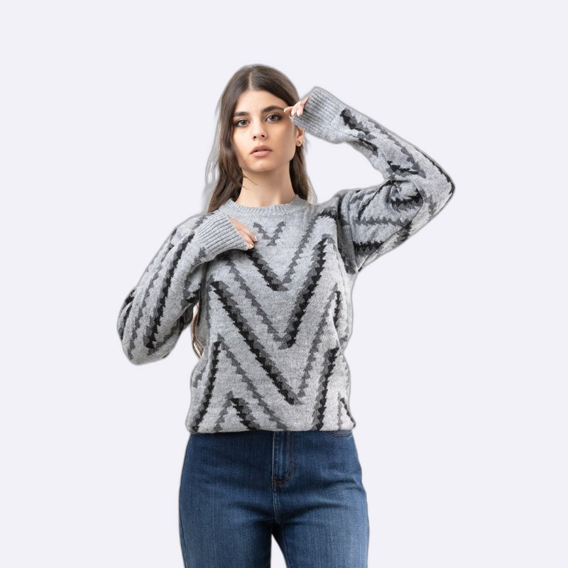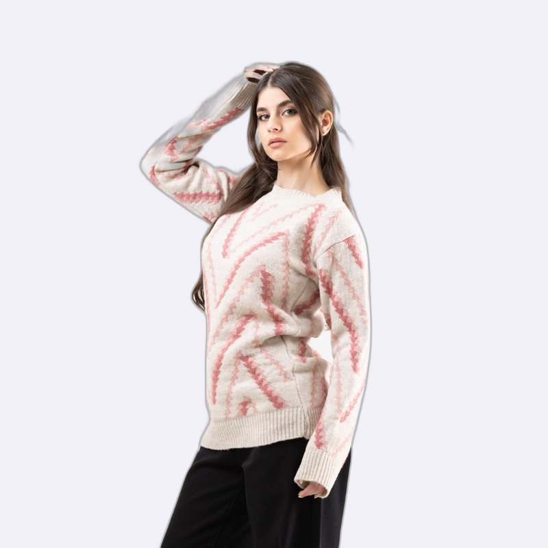 كنزة صوفية محبوكة بياقة مستديرة (Crew Neck) ونقشة جاكار هندسية عصرية، بقصة واسعة قليلاً وأكمام طويلة.