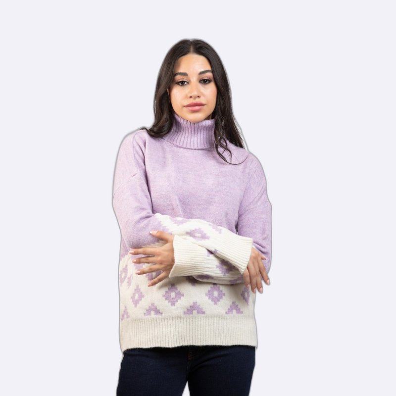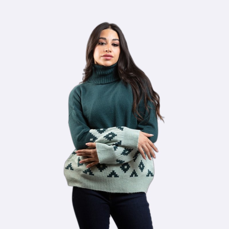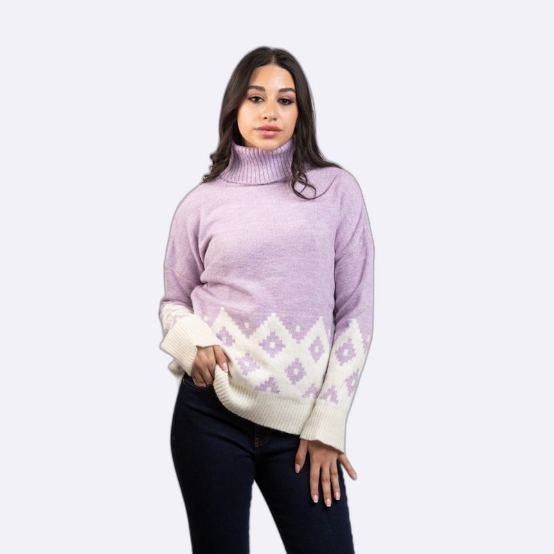 كنزة صوفية مريحة بياقة مدورة، تتميز بنقشة جاكار هندسية عند الأطراف.