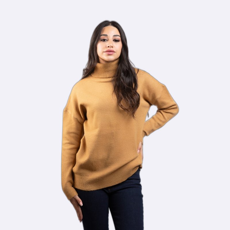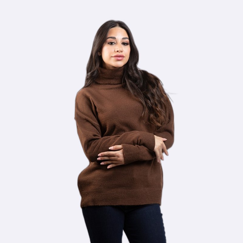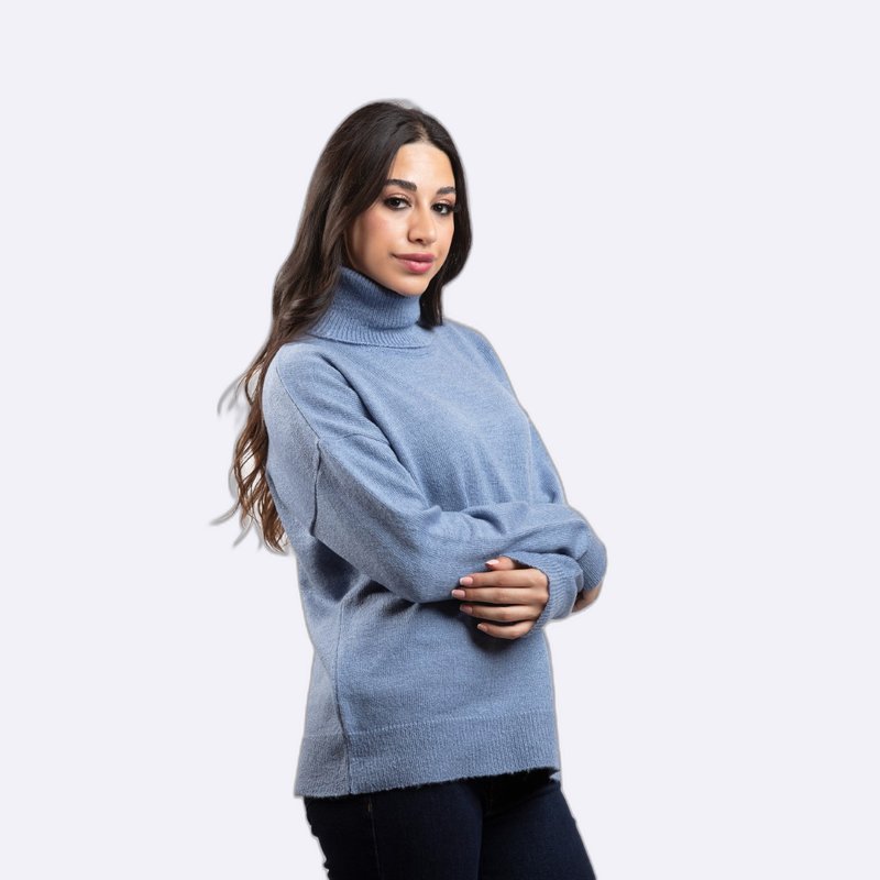 كنزة صوفية مريحة بقصة واسعة جداً، بياقة عالية وأكمام طويلة بأكتاف ساقطة.