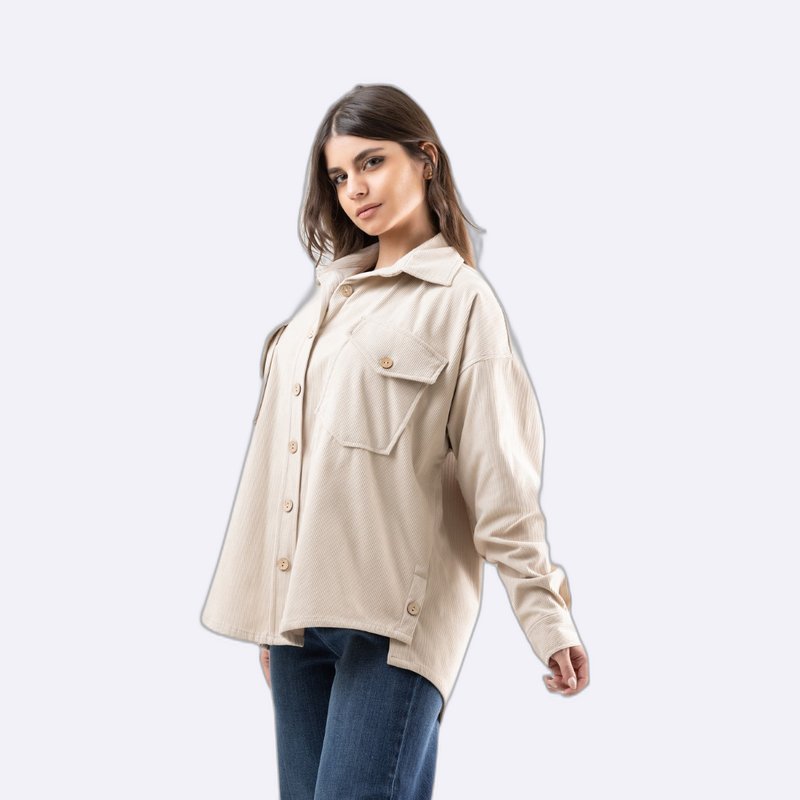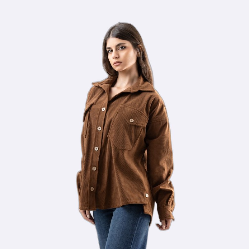 قميص أوفرسايز (Oversize) من الكوردروي بقصة واسعة، يتميز بجيوب أمامية وأزرار خشبية عند الإغلاق والأكمام.