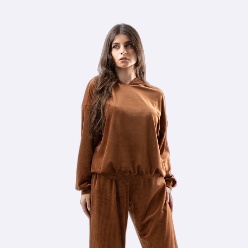 سويت شيرت نسائي بغطاء رأس (Hoodie) وقصة واسعة (Oversize)، مصنوع من قماش المخمل (Velvet) المضلع مع نهايات مطاطية عند الخصر والأكمام.