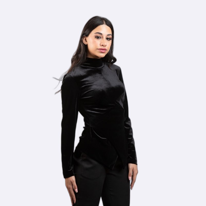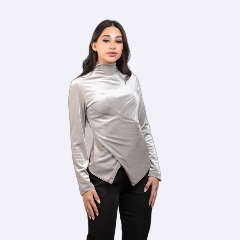بلوزة سهرة نسائية أنيقة بأكمام طويلة وياقة عالية (Mock Neck)، مصنوعة من قماش المخمل اللامع وتتميز بتصميم درابيه (Draped) متداخل من الأمام.