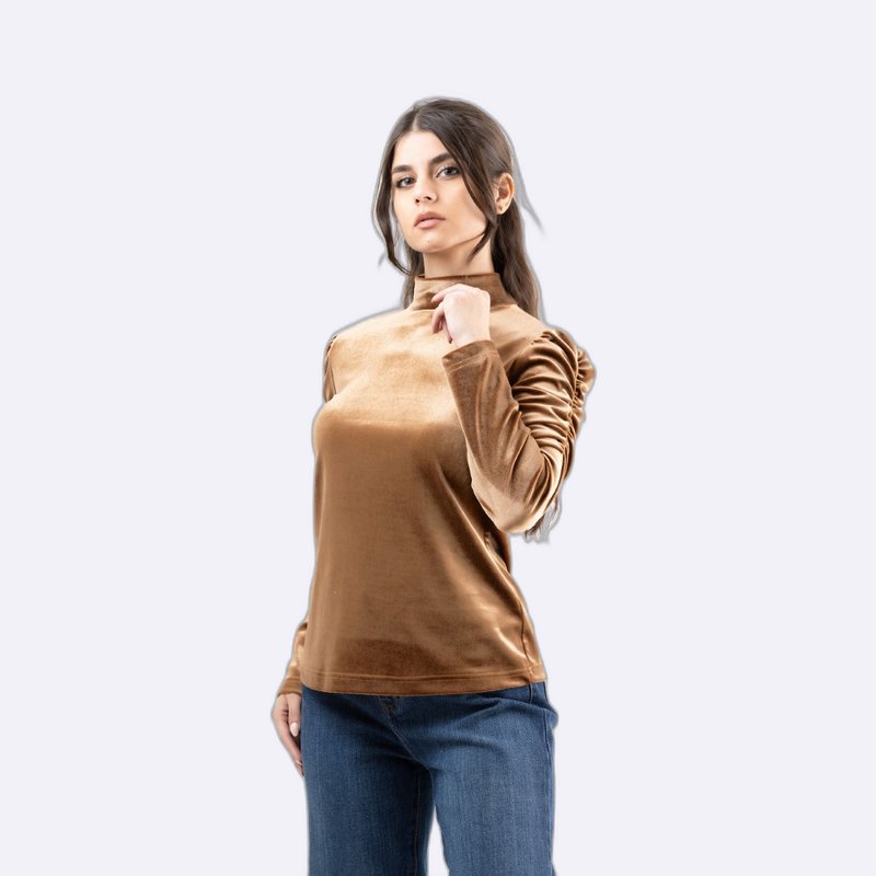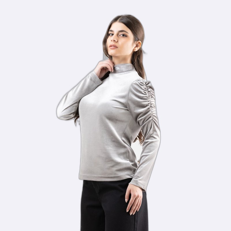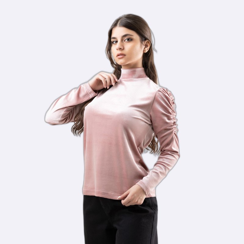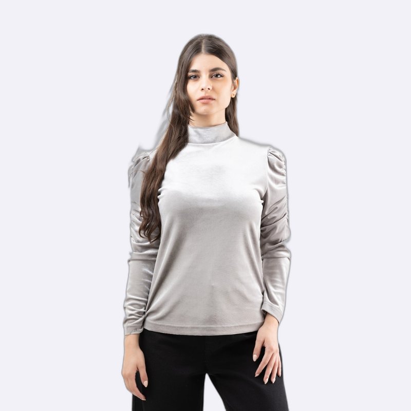 بلوزة نسائية أنيقة بأكمام طويلة وياقة عالية (High Neck)، مصنوعة من قماش المخمل الناعم وتتميز بتفاصيل كشكشة (Shirring) على الأكمام مما يعطيها مظهراً منفوخاً.