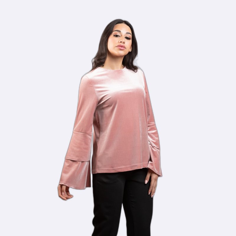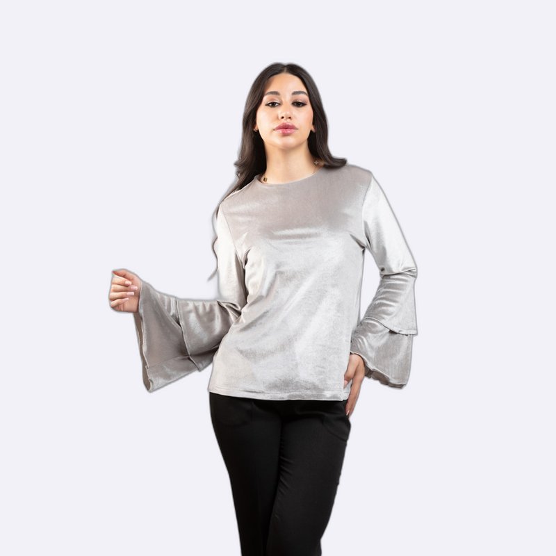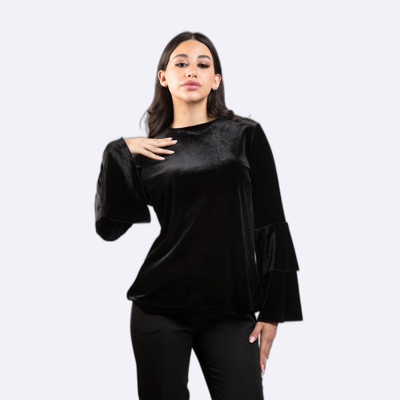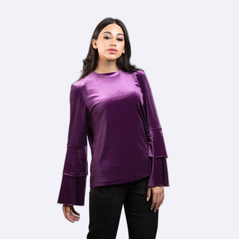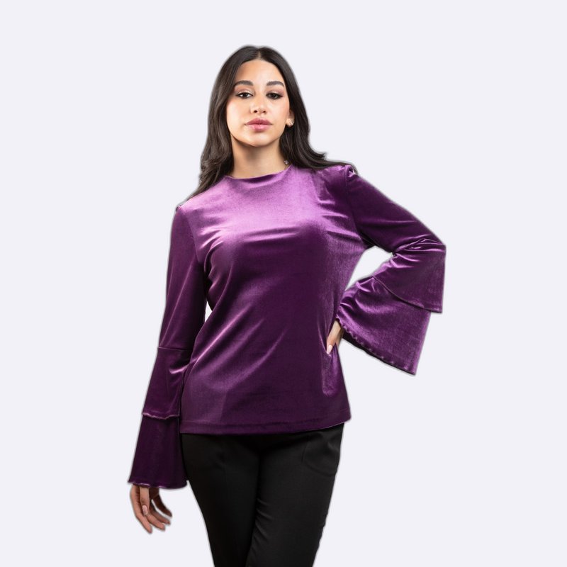 بلوزة سهرة ناعمة من قماش المخمل بياقة دائرية، تتميز بأكمام طويلة بتصميم الجرس (Bell Sleeves) مع طبقات كشكشة متدرجة عند الأطراف تمنحها مظهراً مميزاً.