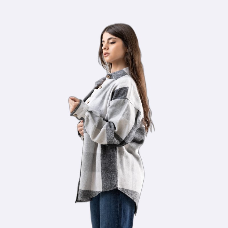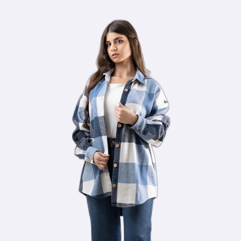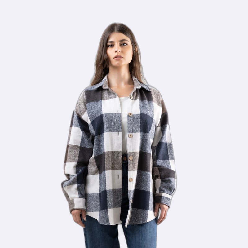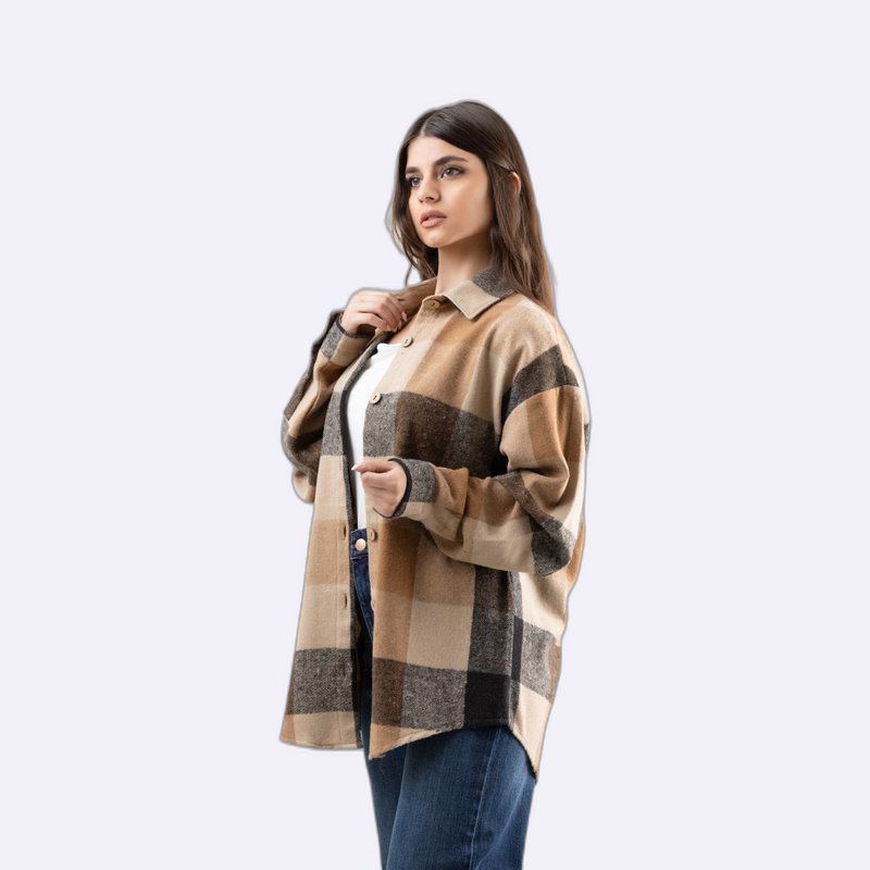 قميص أوفرسايز (Oversize) وسميك بنقشة المربعات (Plaid/Checkered)، يتميز بقصة واسعة، ويمكن ارتداؤه كجاكيت خفيف (Shacket) مع أزرار خشبية عند الإغلاق والجيوب.