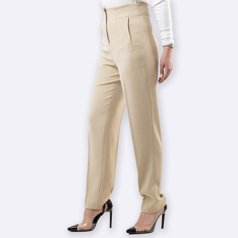 أضيفي لمسة من الأناقة إلى خزانة ملابسك مع هذا البنطلون البيج ذو الخصر العالي. تصميم كلاسيكي ومريح يجعله مثالياً لكل مناسبة.