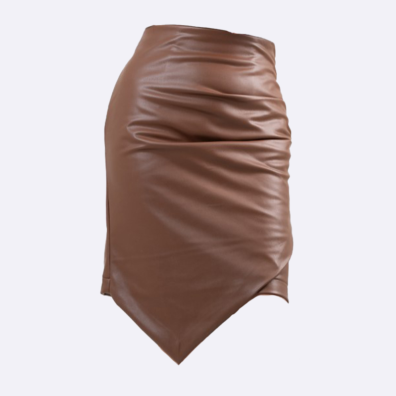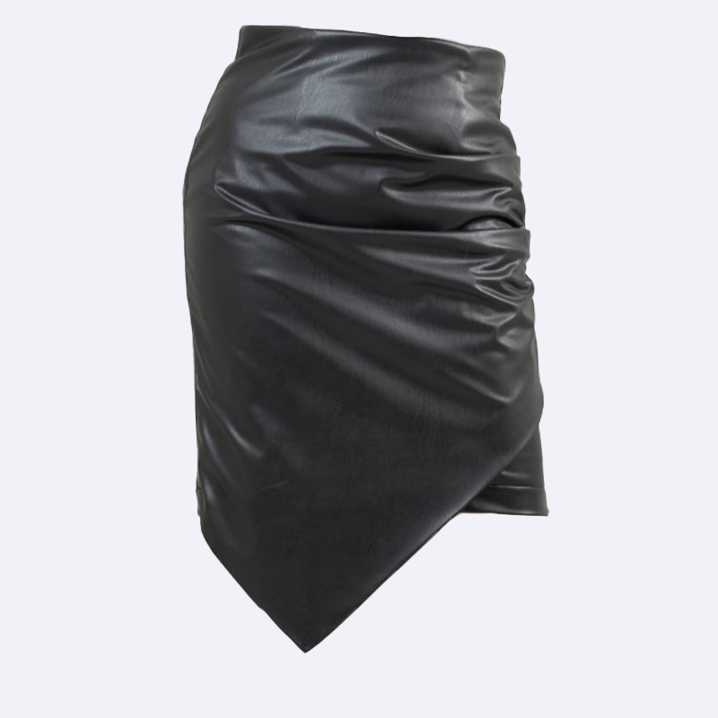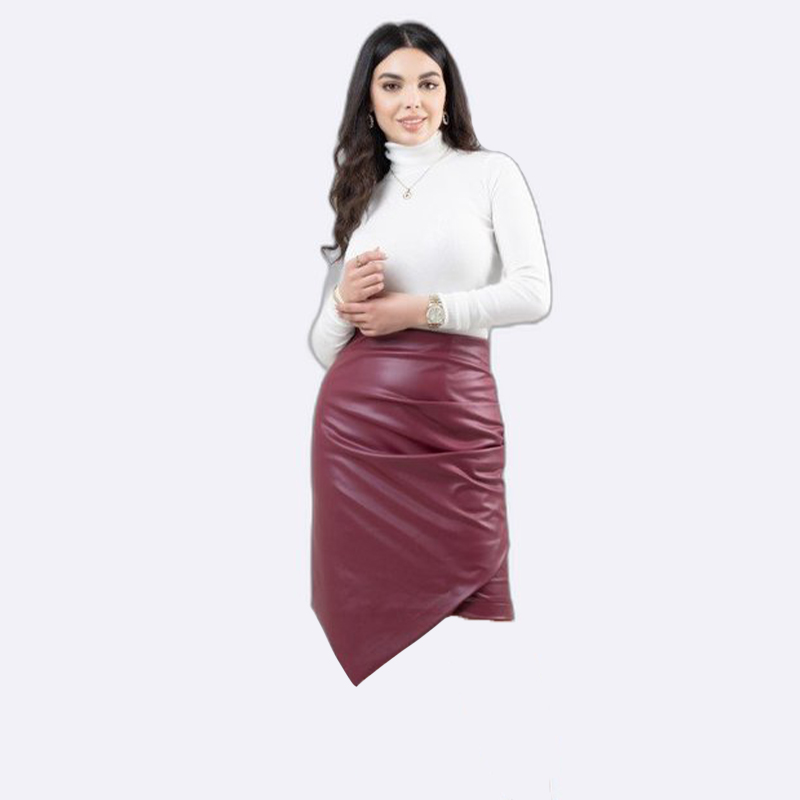 تألقي بإطلالة جريئة وعصرية مع هذه التنورة الأنيقة من الجلد الصناعي باللون العنابي. تصميم فريد بحافة غير متماثلة يضفي لمسة مميزة على مظهرك.