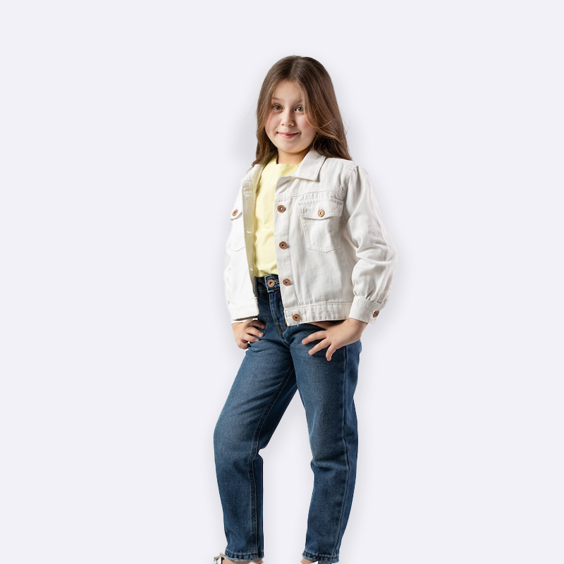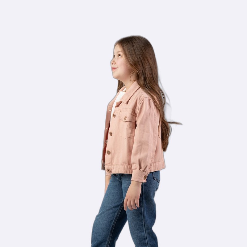 أضيفي لمسة من الأناقة إلى خزانة ملابس ابنتك مع هذا الجاكيت الجينز الوردي الرائع. تصميم عصري ومريح يجعلها مثالية للإطلالات اليومية.
