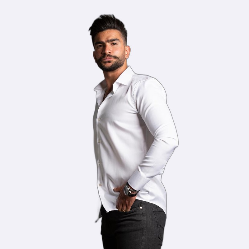 قميص رسمي ناعم بأكمام طويلة وياقة مطوية، يتميز بقصة سليم فيت لإطلالة أنيقة.