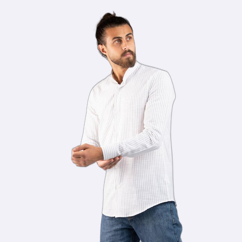 قميص كاجوال بأكمام طويلة ونقشة خطوط عمودية رفيعة، يتميز بياقة ماندرين (بدون طية) لمظهر عصري وبسيط.