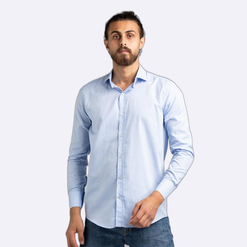 قميص رسمي بأكمام طويلة وقصة مستقيمة، يتميز بياقة مطوية وتصميم ناعم يلائم المناسبات الرسمية واليومية.