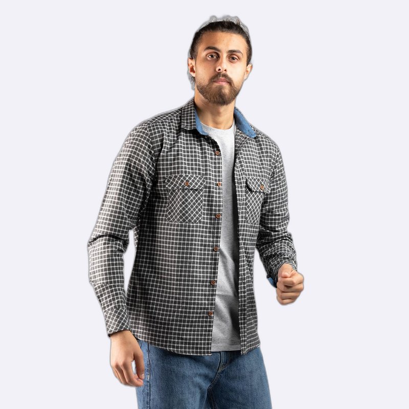 قميص كاجوال بنمط مربعات وأزرار أمامية، يتميز بجيوب مزدوجة وياقة كلاسيكية وتصميم عملي مريح.