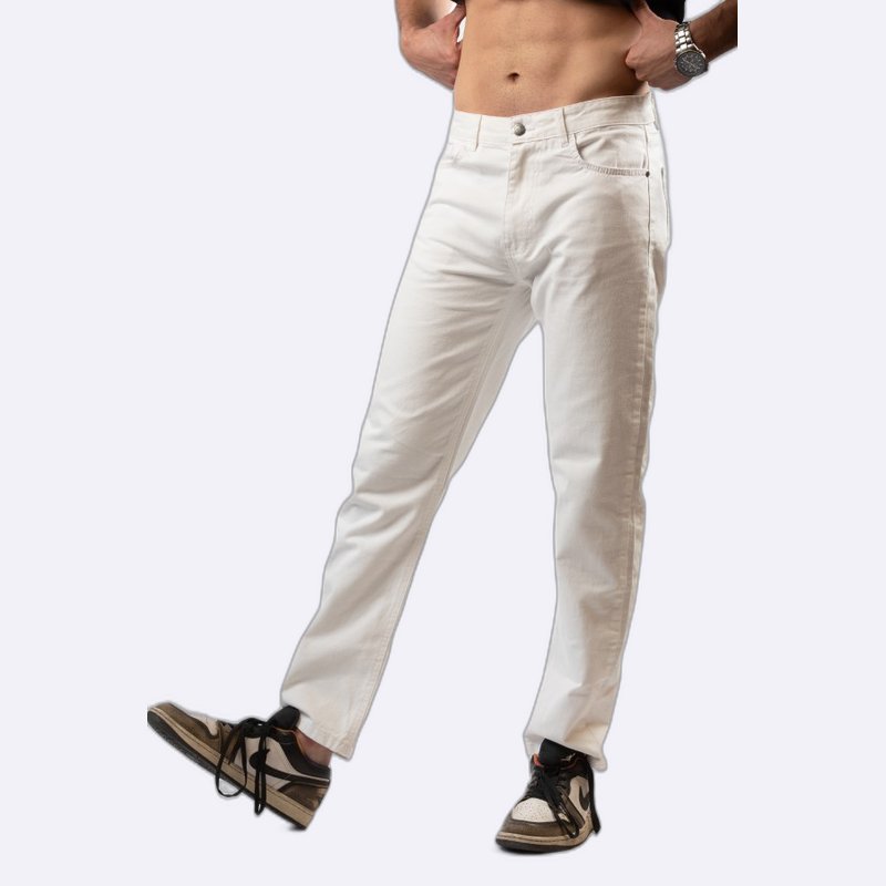 بنطال جينز رجالي بتصميم كلاسيكي، يتميز بقصة أرجل مستقيمة وخمسة جيوب مع إغلاق بزر وسحاب أمامي لمظهر عملي يومي.