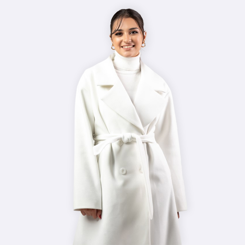 معطف شتوي طويل بتصميم ياقة عريضة وحزام خصر قماشي يمنح مظهراً عصرياً ودافئاً.
