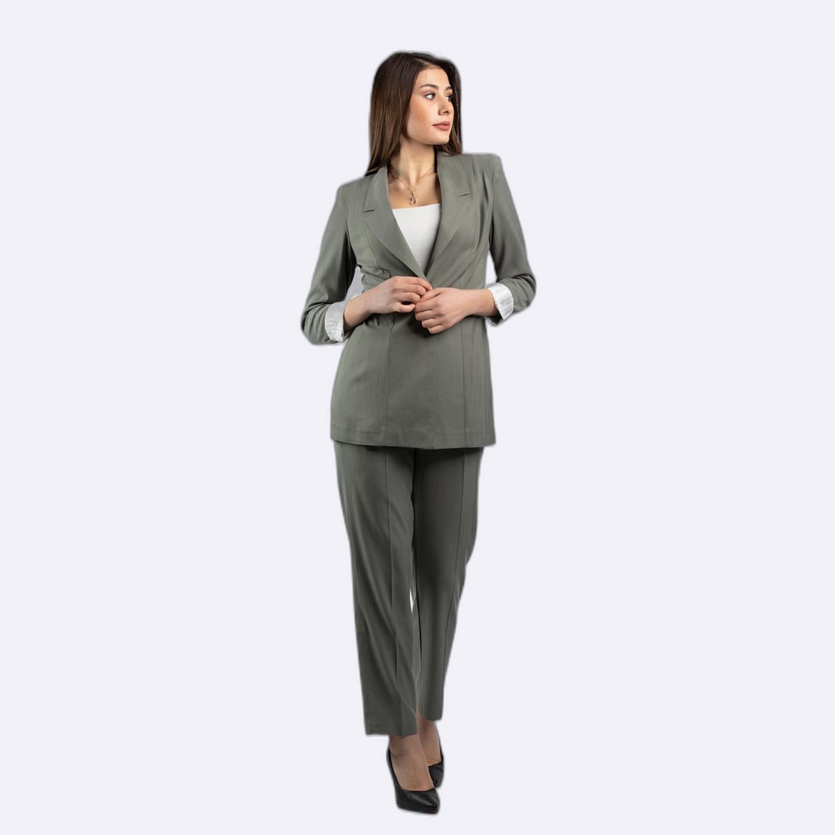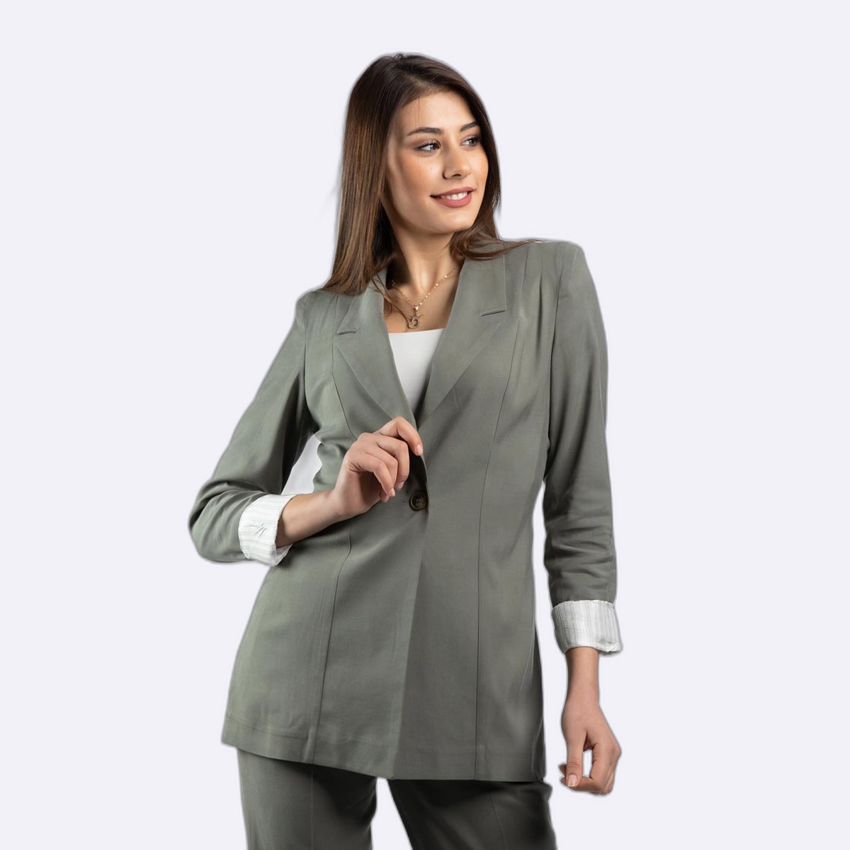 بلازر كلاسيكي بتصميم ياقة رسمية وأكمام مطوية تظهر بطانة داخلية مقلمة.