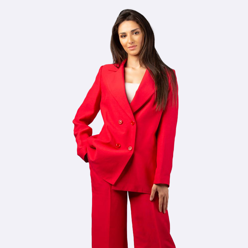 جاكيت رسمي طويل بصفين من الأزرار مع بنطال متطابق