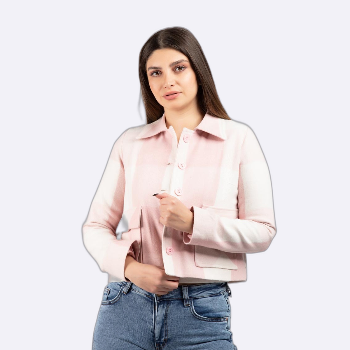جاكيت بقصة قصيرة مستوحاة من نمط القميص، يتميز بياقة كلاسيكية وصف أزرار أمامي وجيوب صدر كبيرة، ومزين بنمط مربعات عريضة.