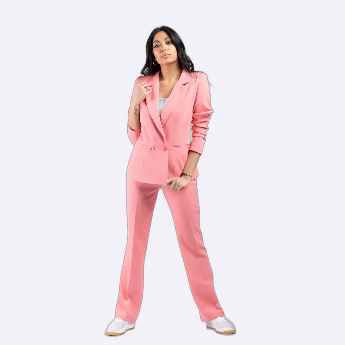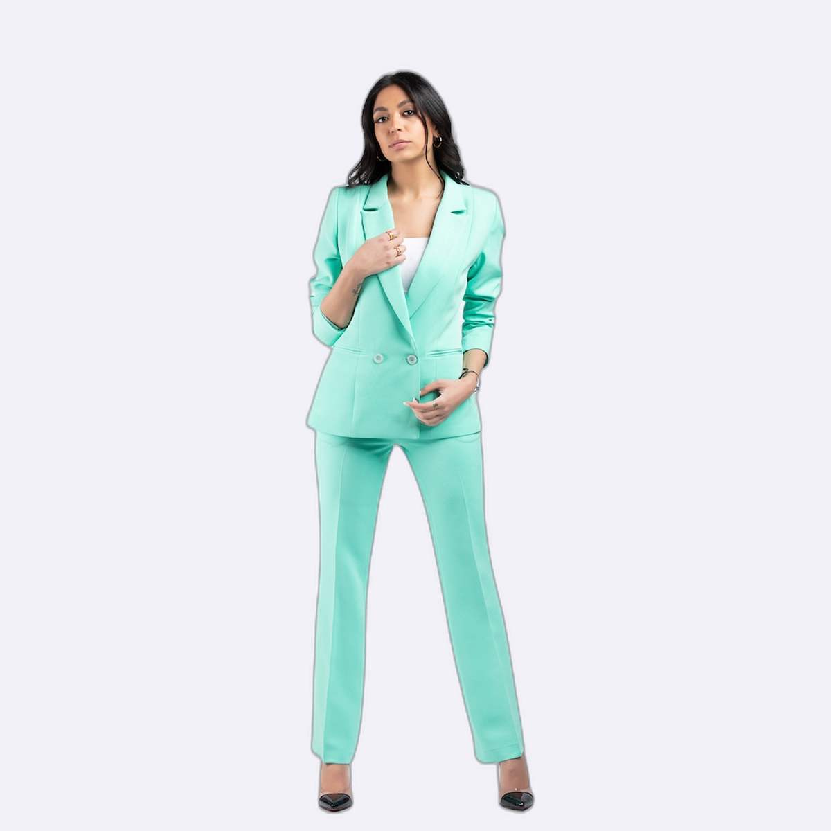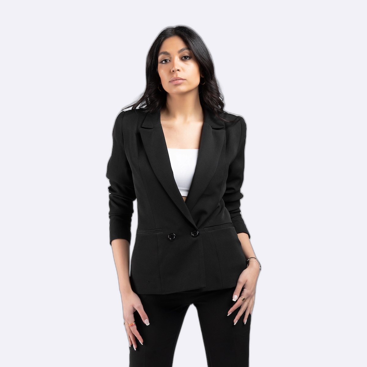جاكيت بليزر طويل بتصميم كلاسيكي أنيق، يتميز بصفين من الأزرار الأمامية المزدوجة وياقة مطوية رسمية وجيوب مدمجة على الجانبين