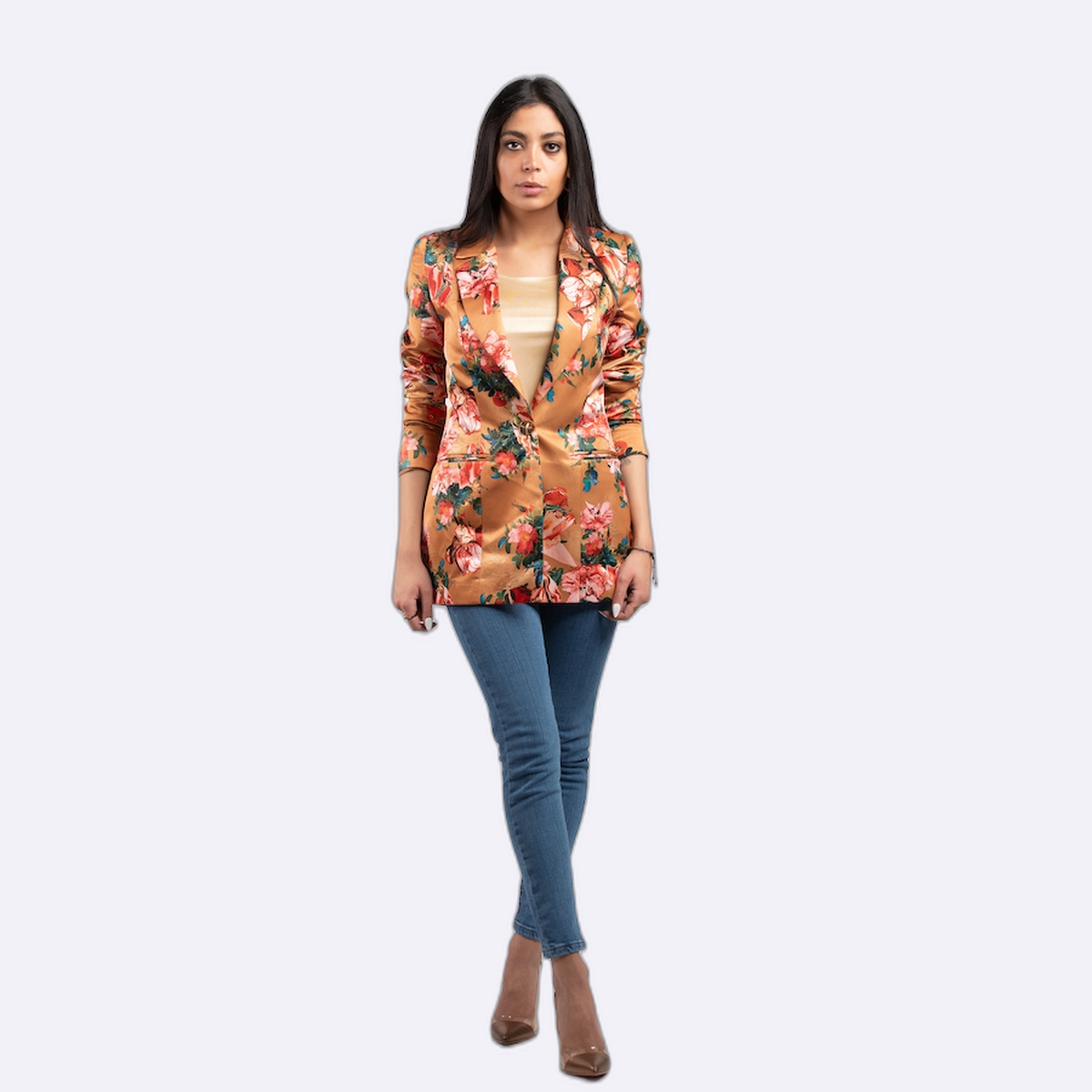جاكيت بليزر عصري مصنوع من قماش الستان الناعم واللامع، يتميز بنقوش زهور غنية ومتنوعة تغطي كامل القطعة، مع ياقة كلاسيكية مفتوحة وأكمام طويلة