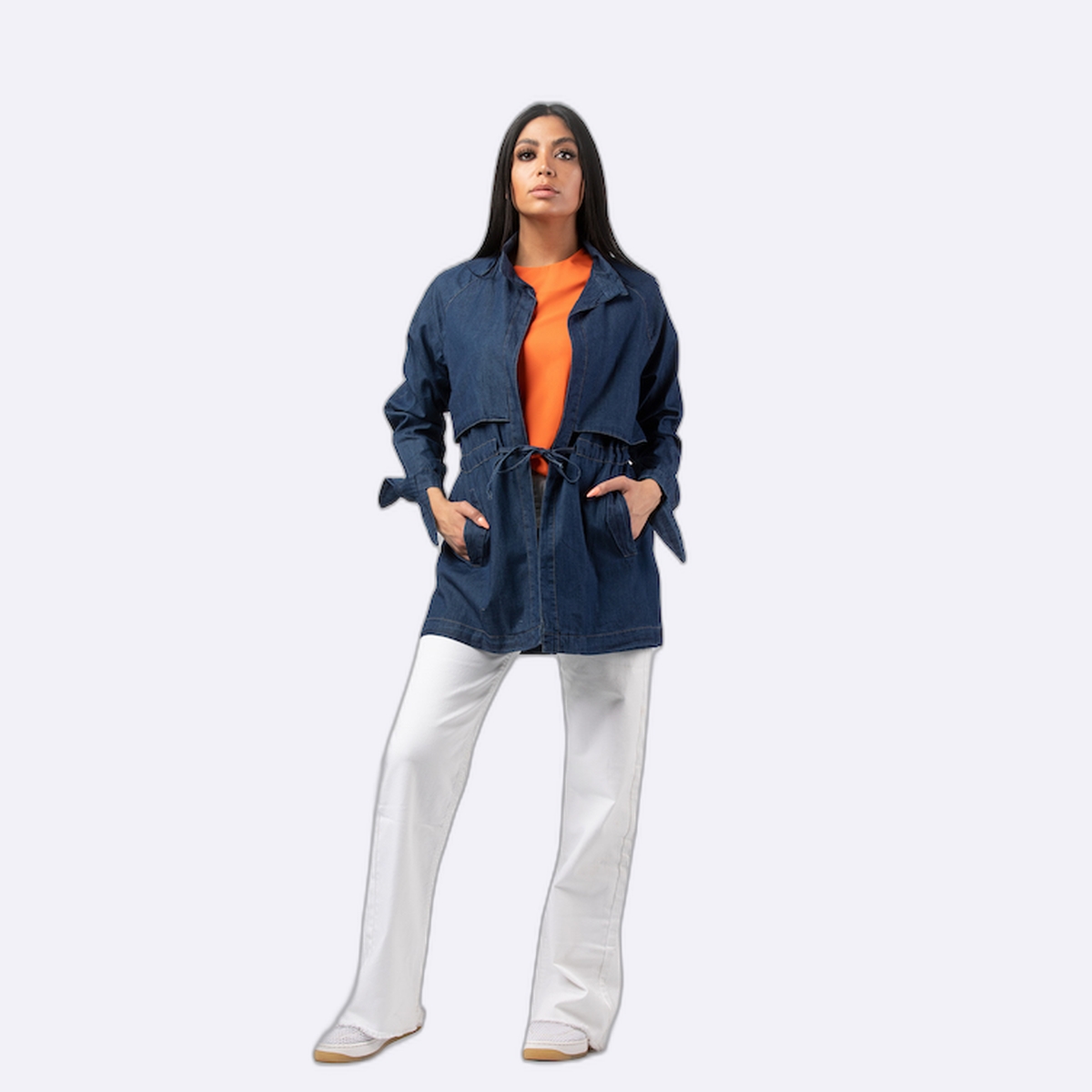 جاكيت مصنوع من قماش الدينيم (الجينز) بتصميم عملي، يتميز بفتحة جانبية على الصدر بأسلوب عصري، ومزود برباط مطاطي عند الخصر لتحديد القوام