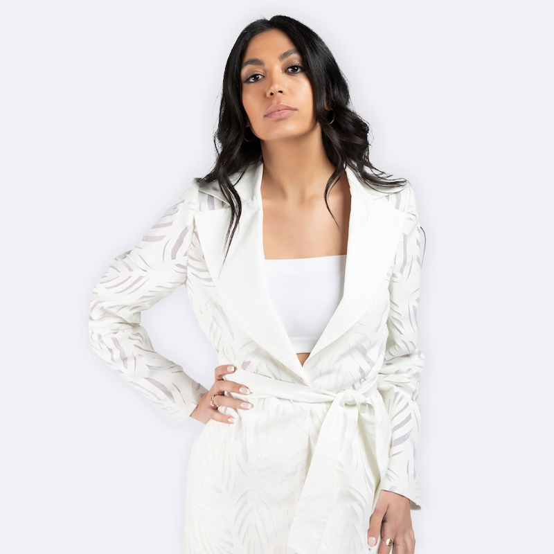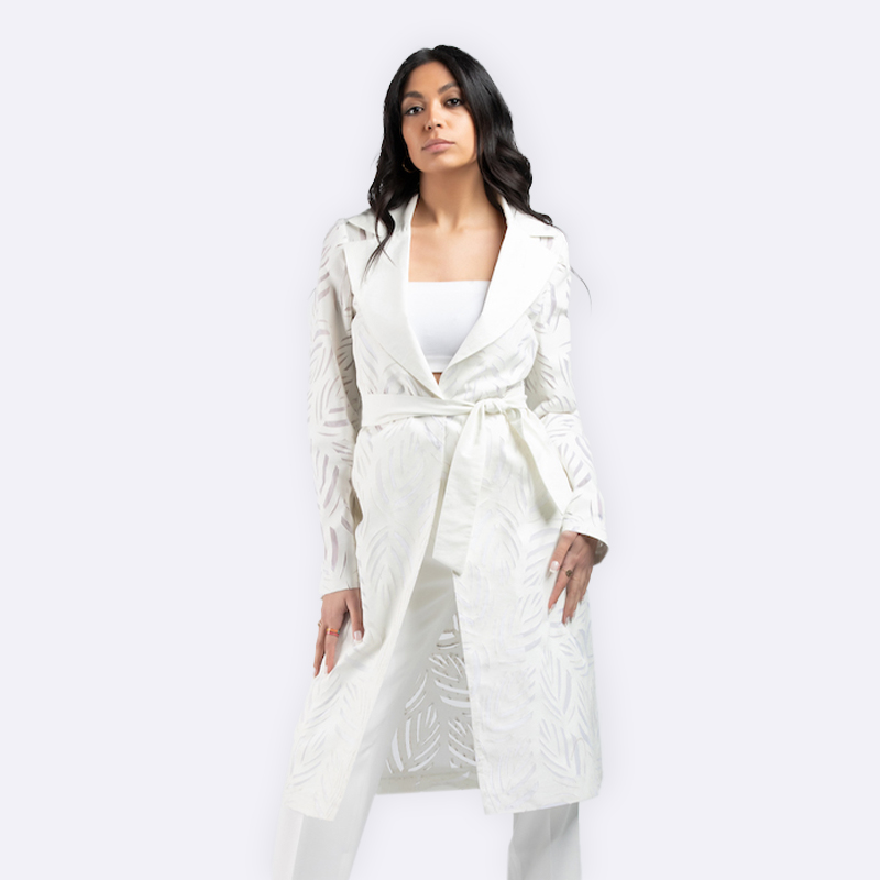 جاكيت طويل بتصميم فني راقٍ، يتميز بقصة انسيابية وياقة كلاسيكية عريضة مطوية، ومزين بنقوش مفرغة على شكل أوراق شجر دقيقة تغطي القطعة.