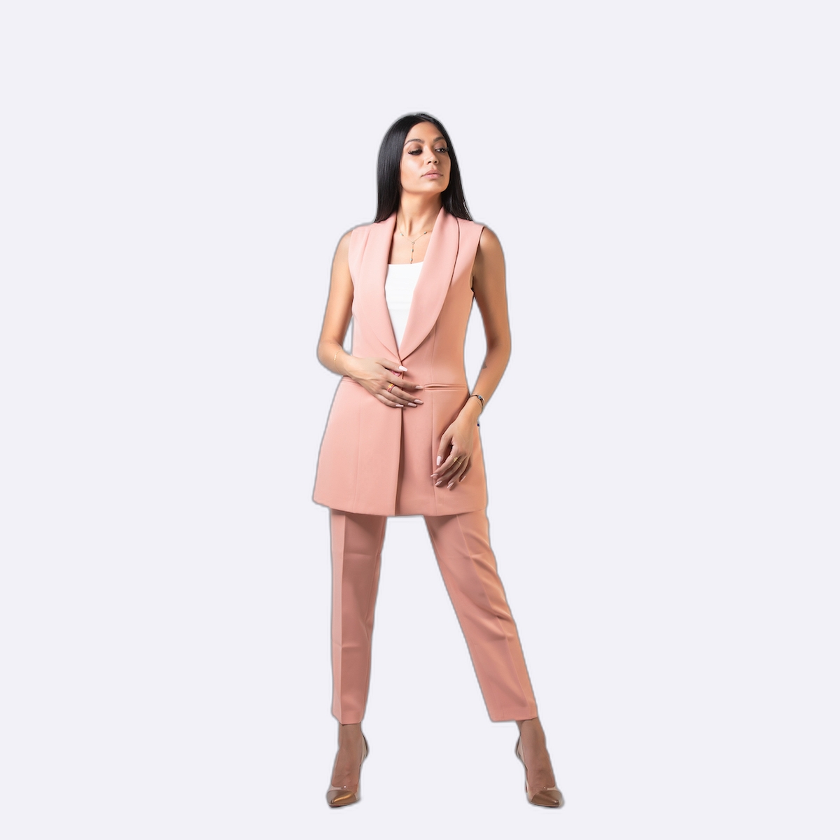 جاكيت بليزر بدون أكمام (فيست) بتصميم عصري وأنيق، يتميز بقصة ضيقة ومحددة للجسم وياقة كلاسيكية مطوية (شال) تمتد لطرف القطعة.