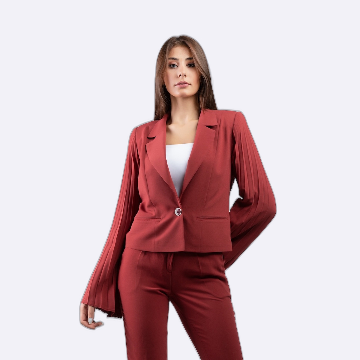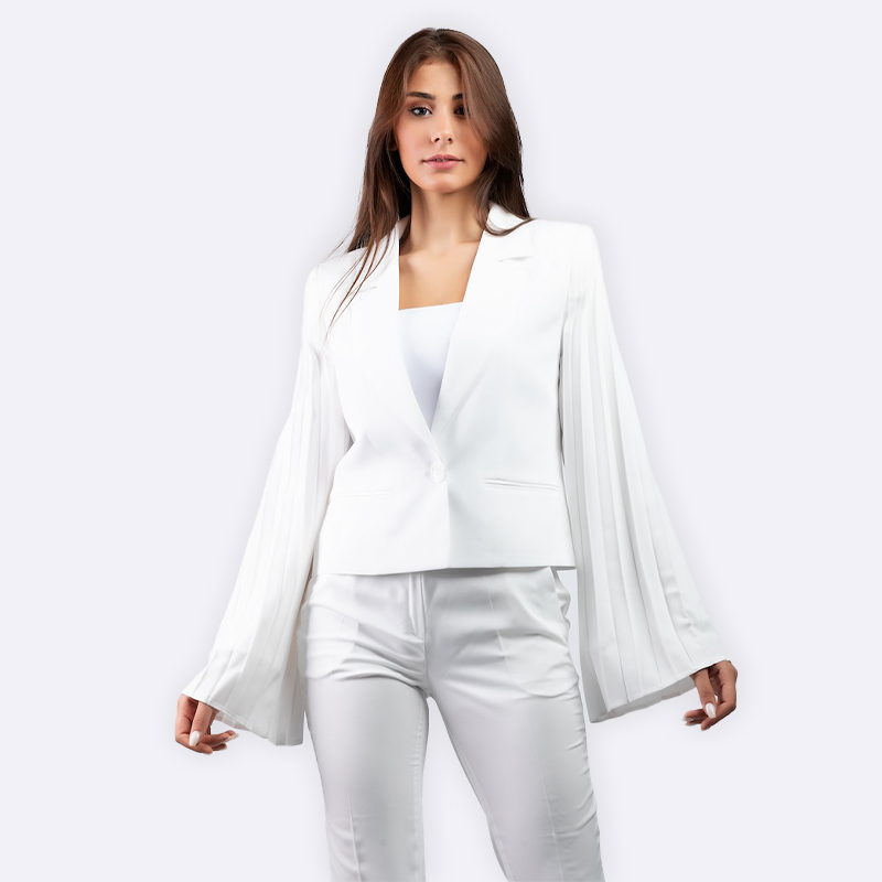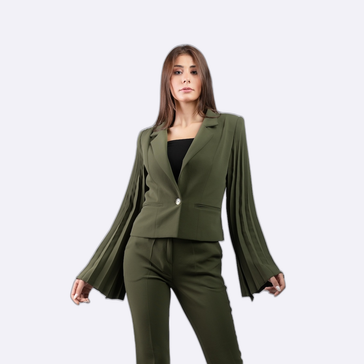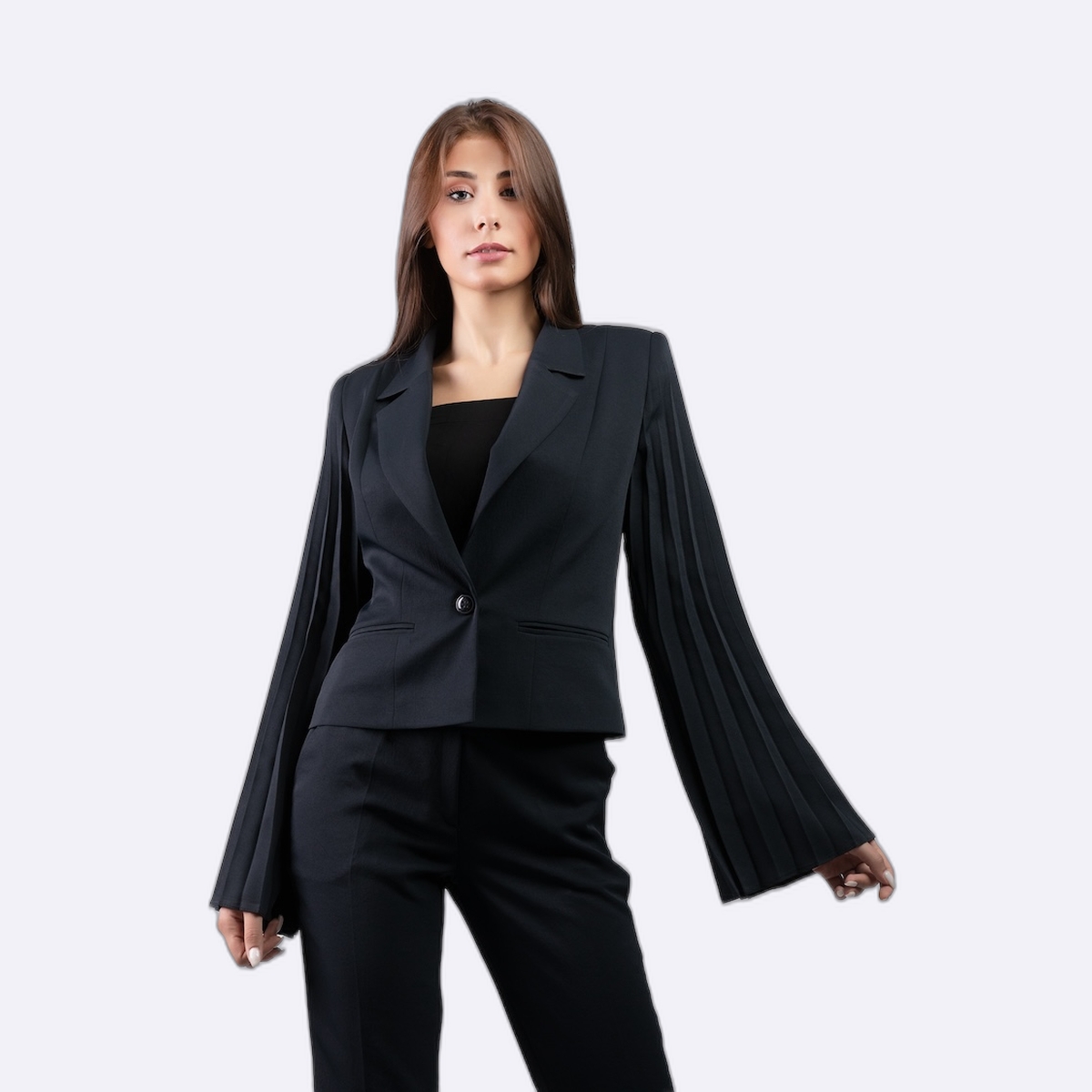 جاكيت بليزر قصير بتصميم عصري وفريد، يتميز بياقة كلاسيكية مطوية وزر واحد للإغلاق، وتتفرد القطعة بأكمام واسعة ومكسرة (بليسيه) تضفي لمسة جمالية.