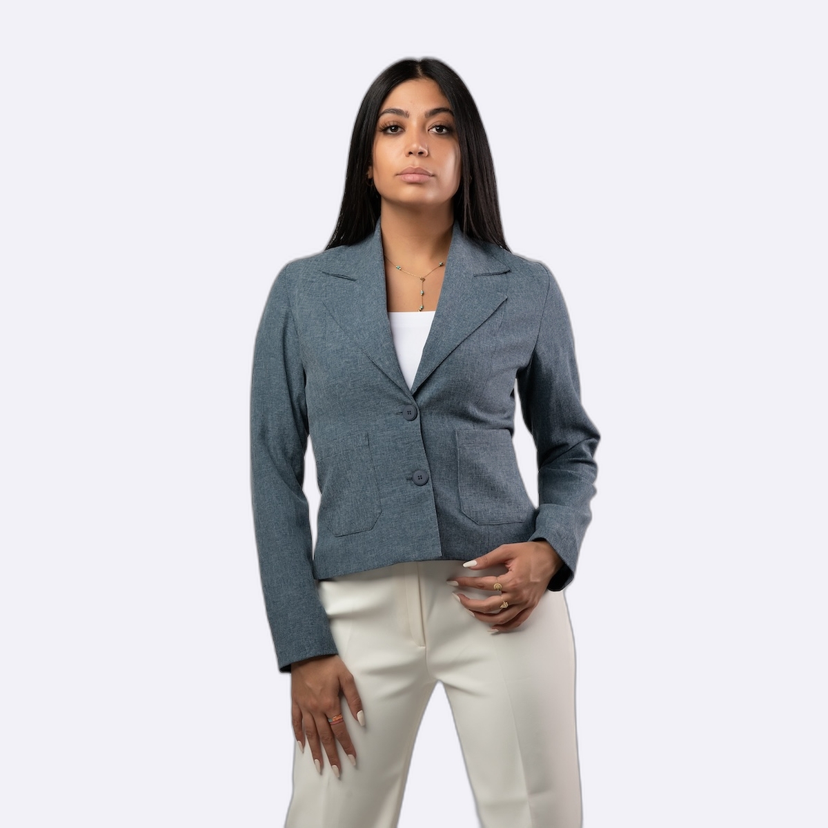 جاكيت رسمي بياقة مدببة وأزرار أمامية مزدوجة، يتميز بقصة مستقيمة وجيوب جانبية كلاسيكية لمظهر عملي أنيق