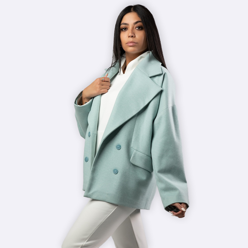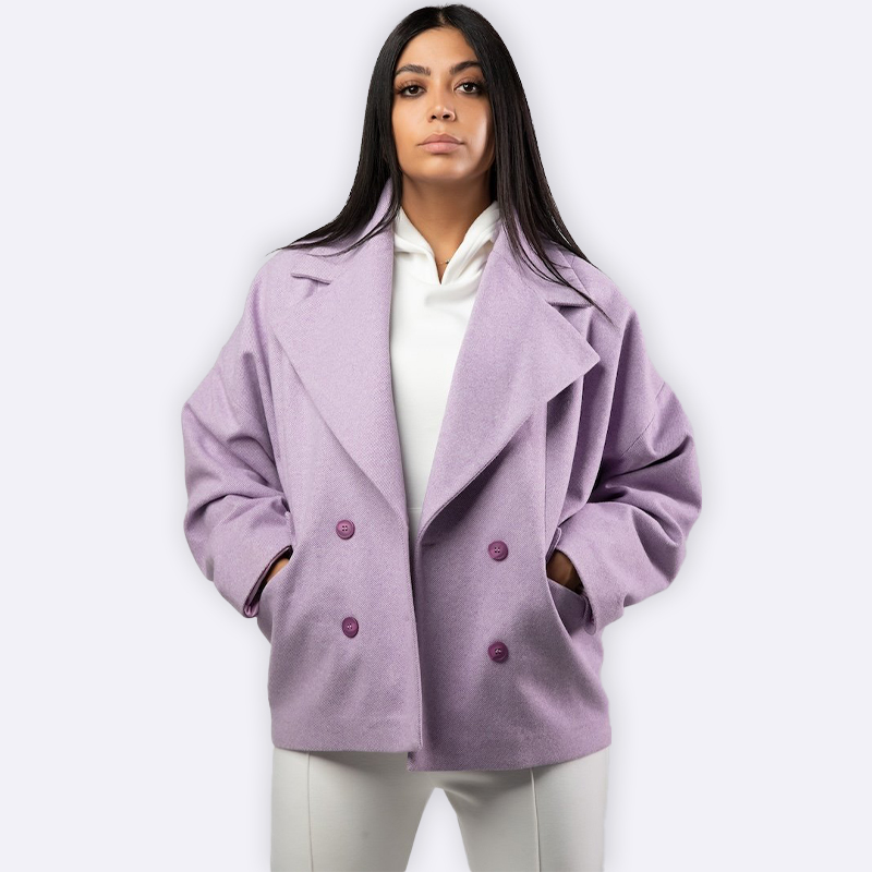 جاكيت رسمي بياقة عريضة مطوية وقصة محددة عند الخصر، يتضمن زر واحد للإغلاق وجيوب جانبية رفيعة مدمجة