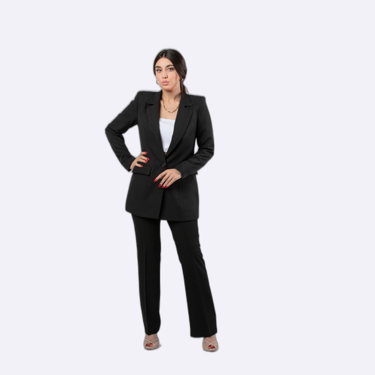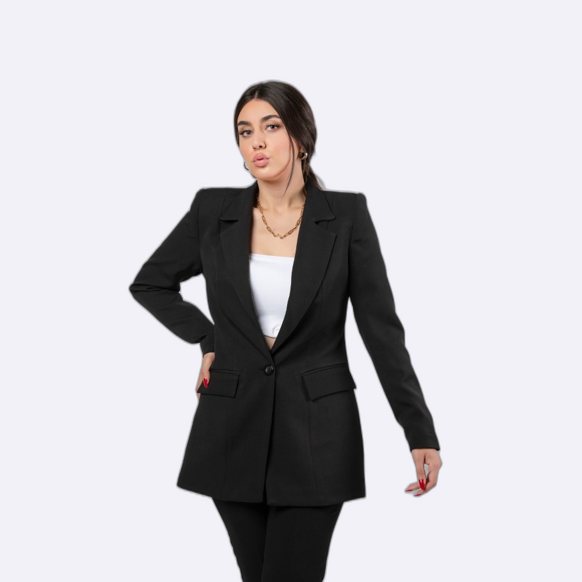 جاكيت رسمي طويل بقصة متقنة وياقة عريضة يمنح مظهراً انسيابياً وجذاباً يلائم بيئة العمل والاحتفالات