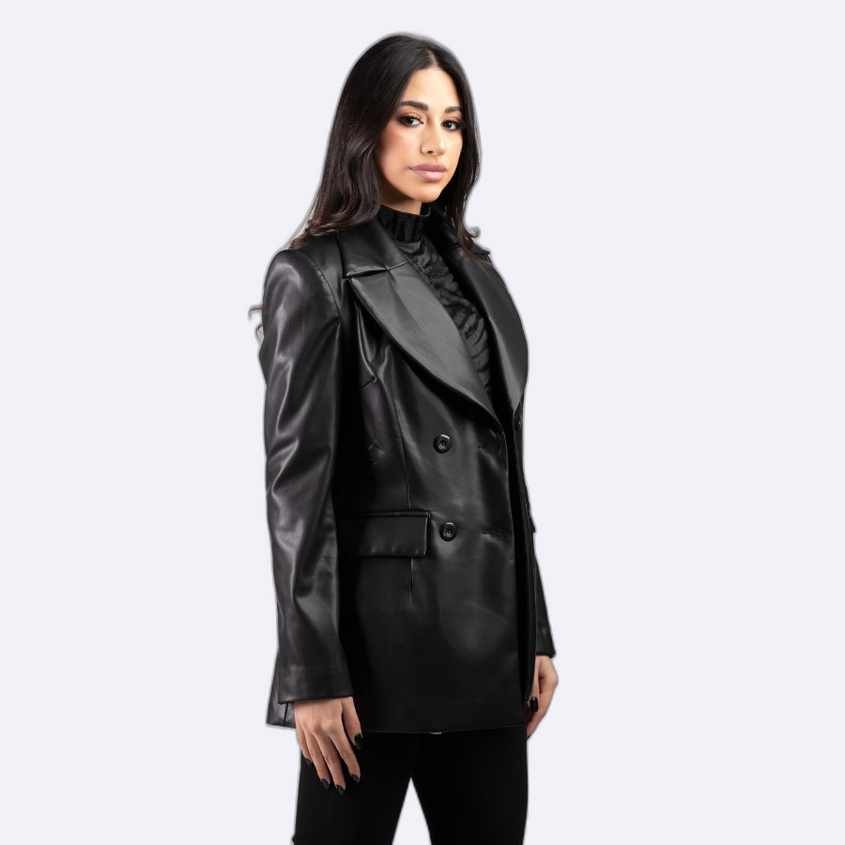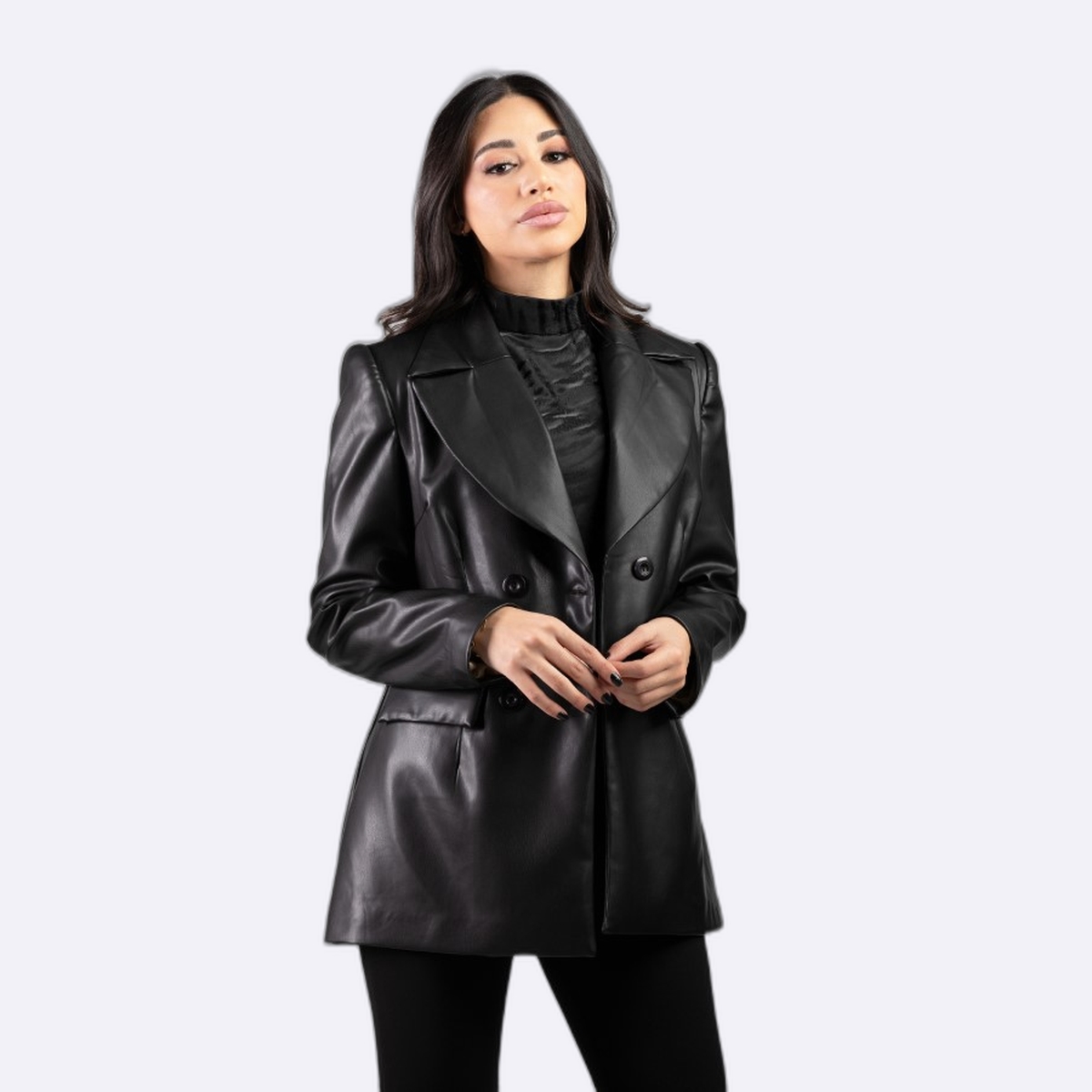 جاكيت بليزر بتصميم رسمي عصري مصنع من الجلد بياقة عريضة وأزرار أمامية مزدوجة مع جيوب جانبية لمظهر أنيق وقوي.