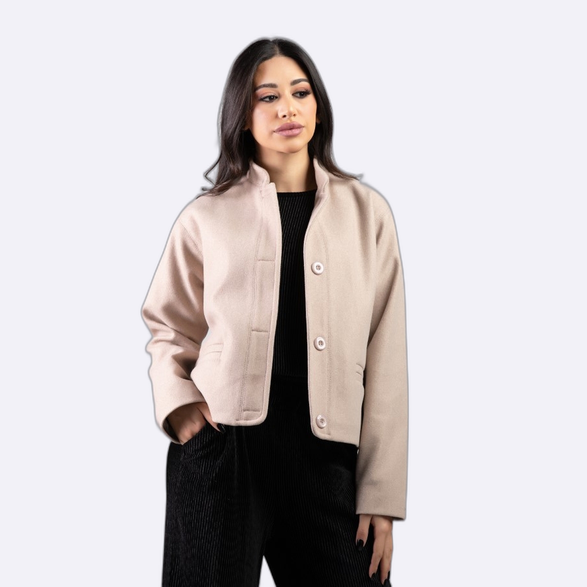 جاكيت بتصميم عصري وبسيط يتميز بياقة قصيرة وأزرار أمامية بارزة مع جيوب جانبية ناعمة ليوفر إطلالة أنيقة وعملية تناسب مختلف الأوقات.