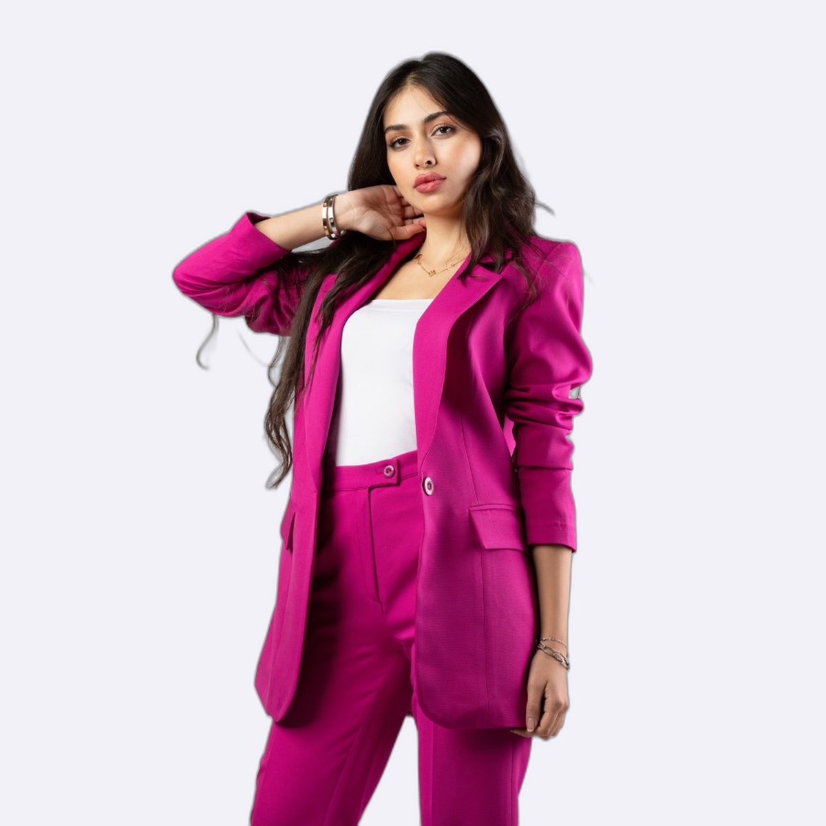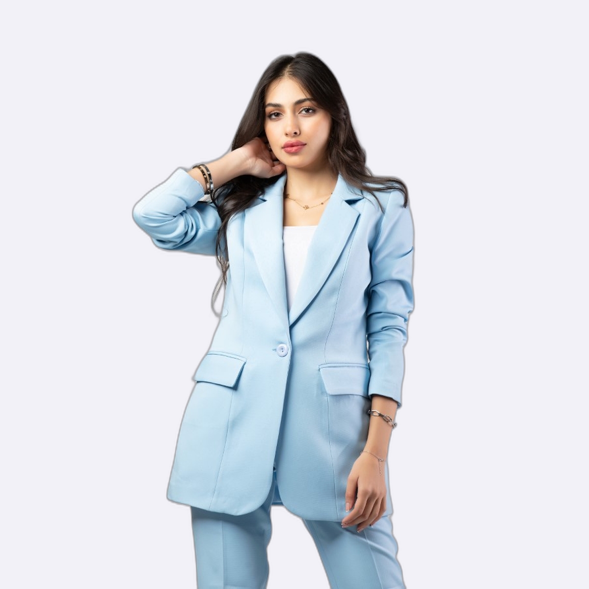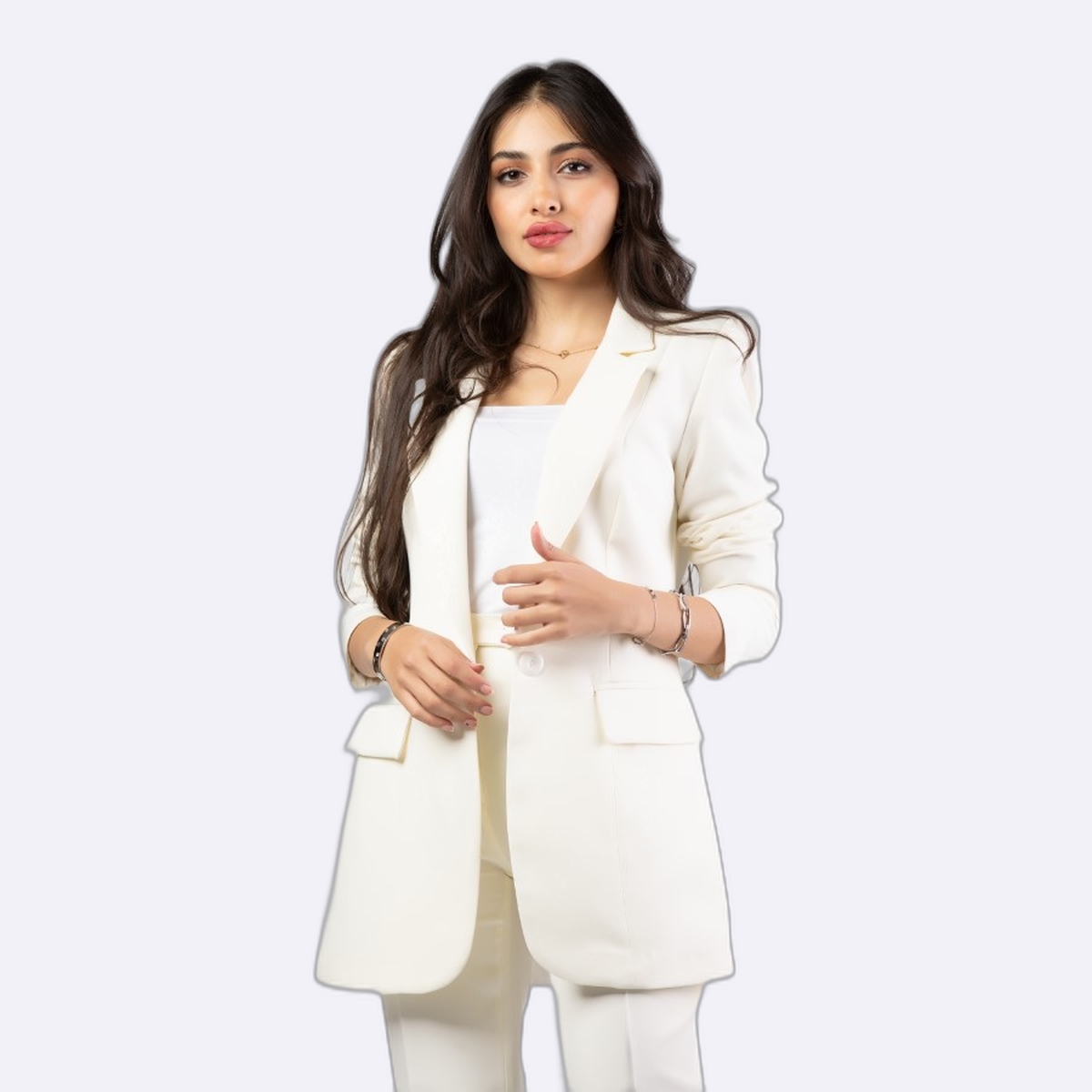 جاكيت رسمي يتميز بقصة كلاسيكية أنيقة مع ياقة مدببة وزر أمامي وجيوب جانبية بغطاء ليمنح إطلالة احترافية ومميزة.