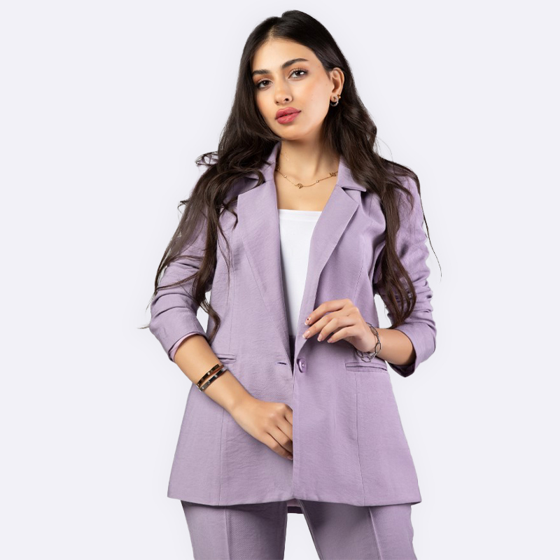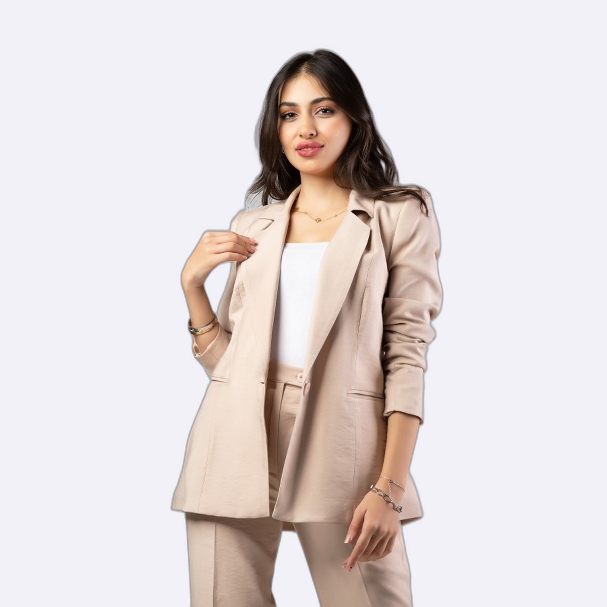 جاكيت رسمي بقصة متقنة يضم ياقة كلاسيكية وجيوب جانبية مخفية ليمنح إطلالة مهنية راقية وعصرية تناسب العمل والمناسبات.
