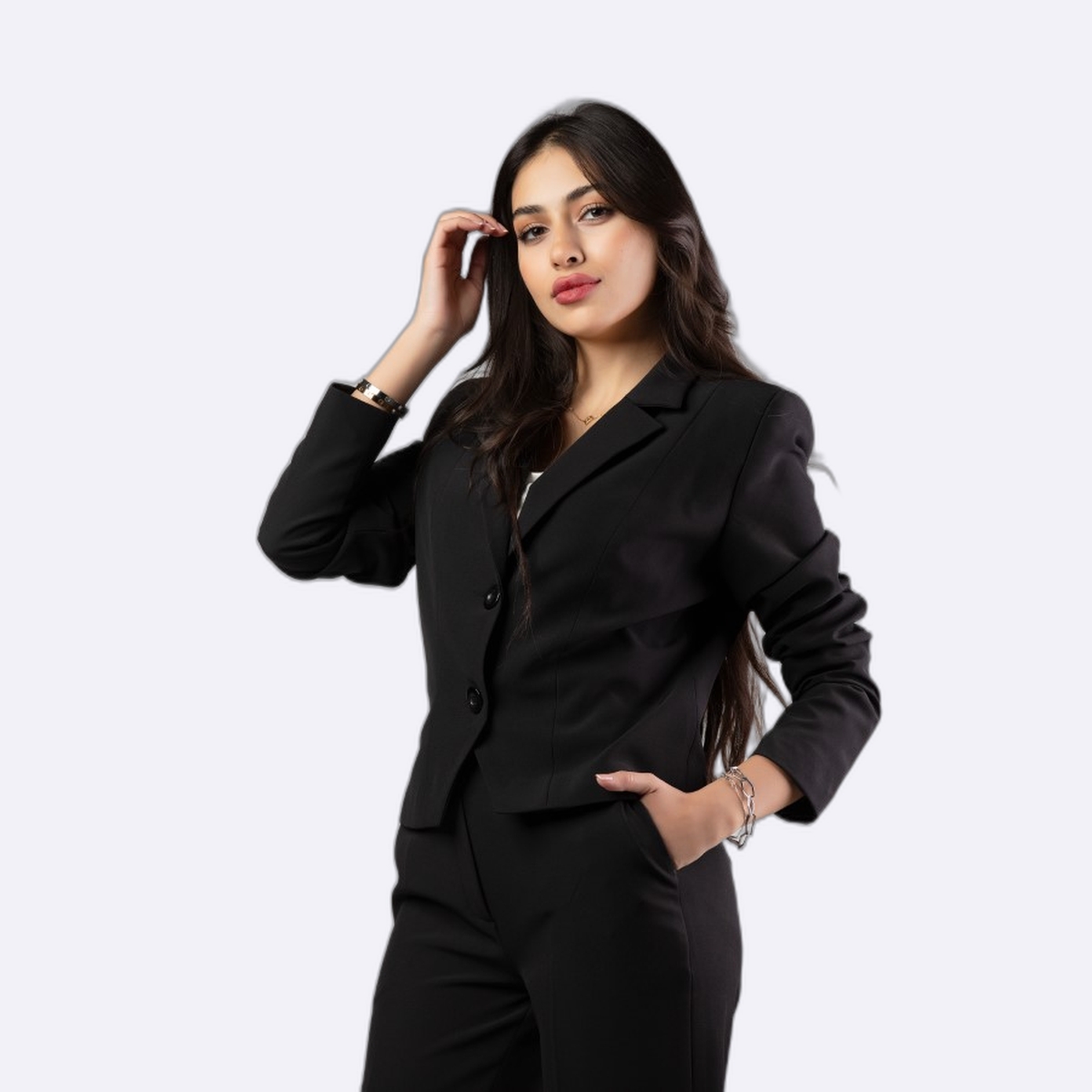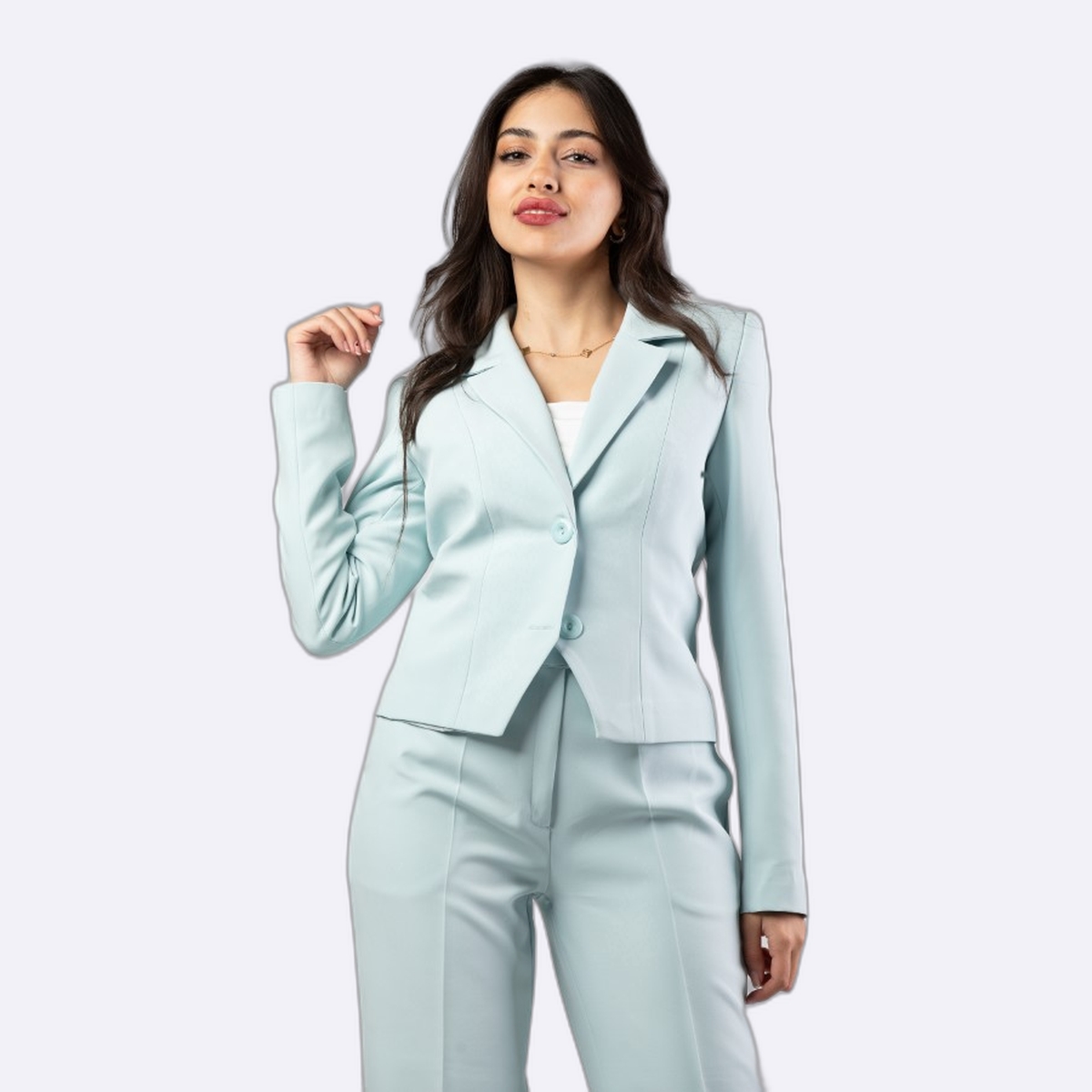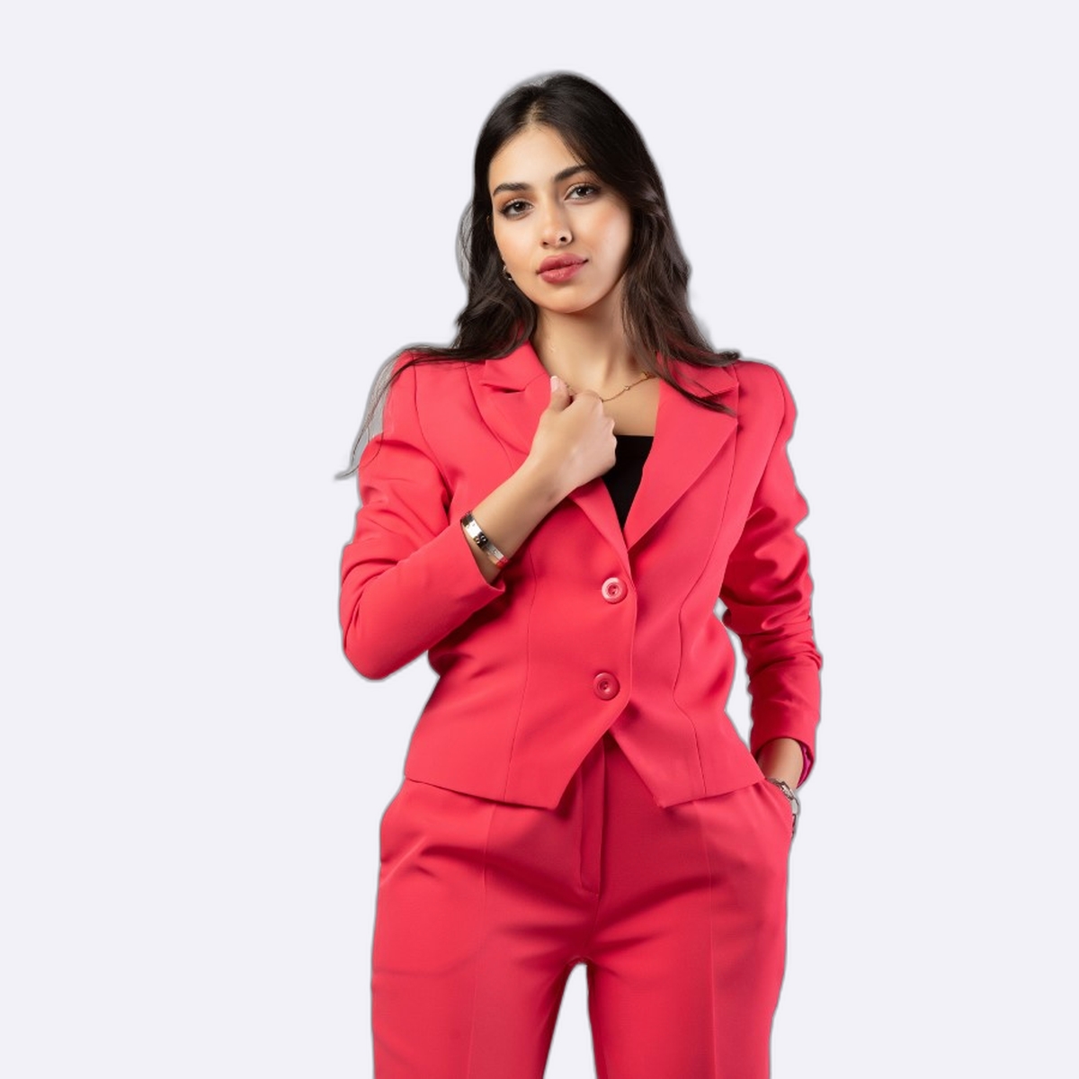 جاكيت رسمي نسائي بقصة ضيقة ومحددة للجسم، يتميز بياقة كلاسيكية وزرين أماميين لونه وردي زاهي، مما يضفي لمسة من الأناقة العصرية على إطلالتك.