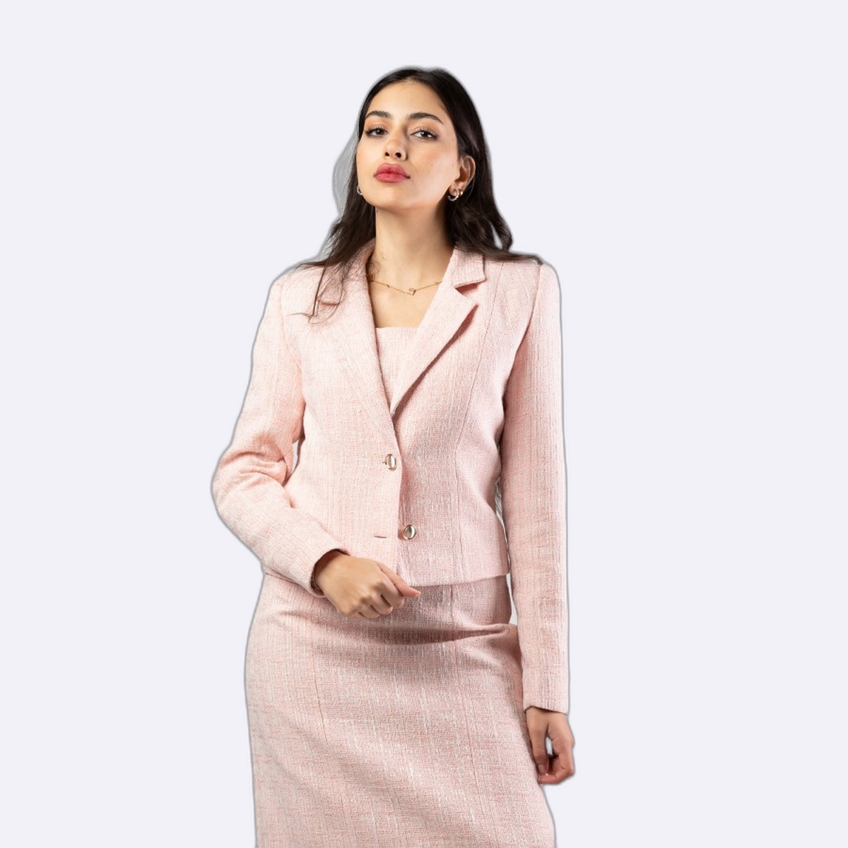 جاكيت بتصميم كلاسيكي من قماش التويد الفاخر يتميز بياقة رسمية وأزرار أمامية أنيقة وقصة قصيرة تمنح مظهراً راقياً وجذاباً.