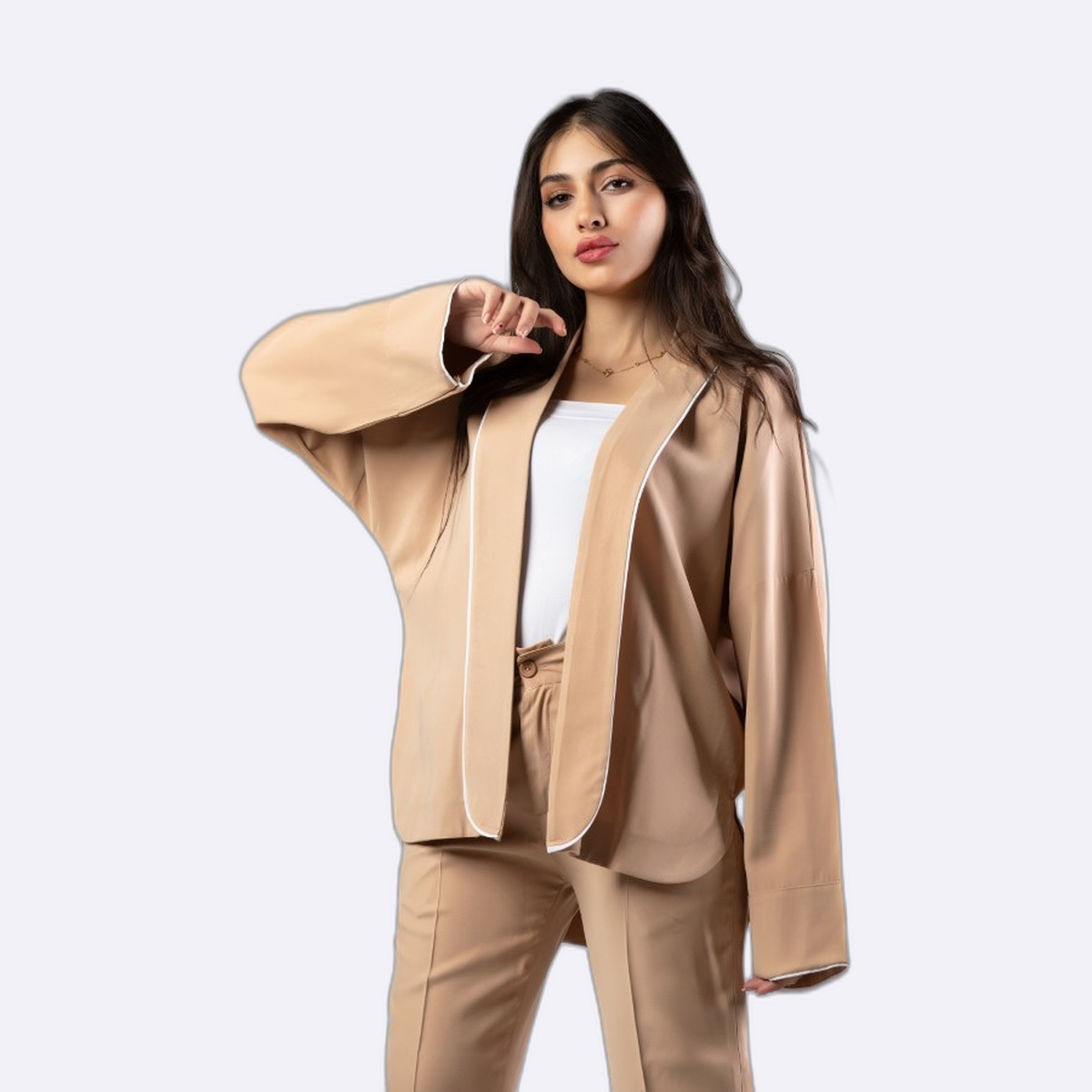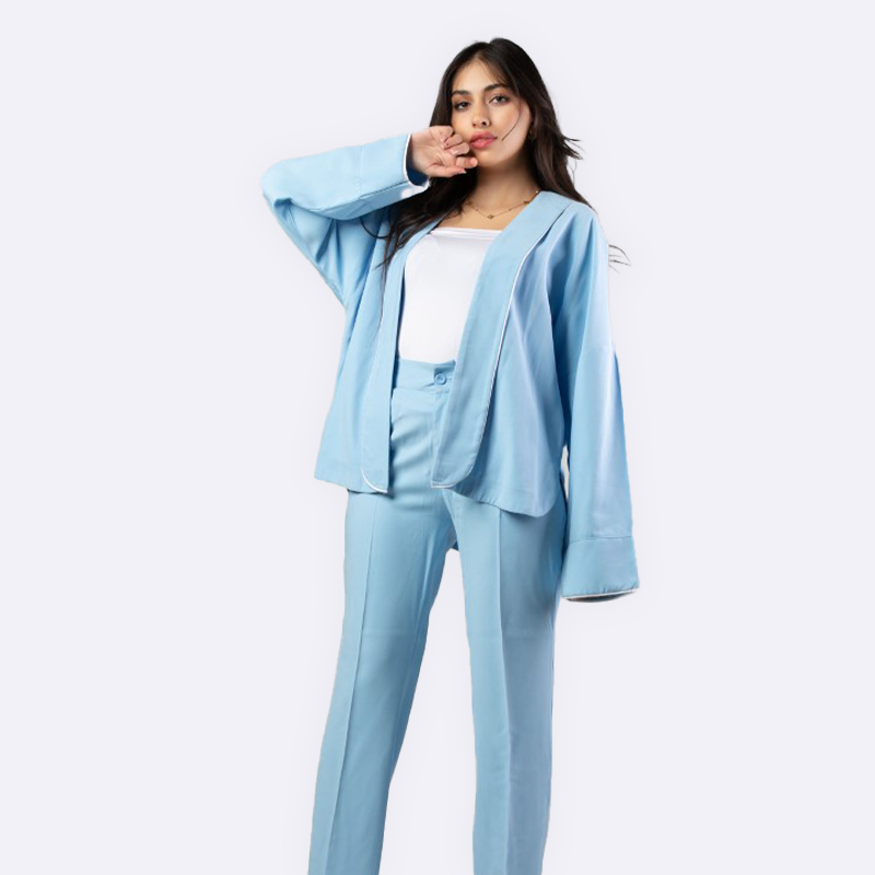 جاكيت عصري مريح بستايل الأوفر سايز، يتميز بلون أزرق سماوي هادئ وتصميم مفتوح وبسيط مع حواف بيضاء رفيعة تضيف لمسة أنيقة، مناسب للإطلالات اليومية الكاجوال.