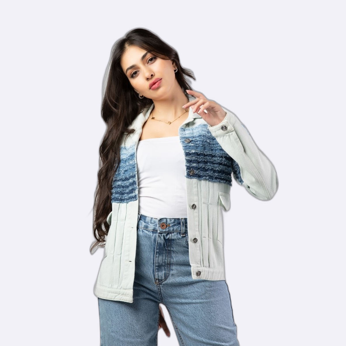 جاكيت جينز بتصميم عصري يجمع بين اللونين الأبيض والأزرق بأسلوب متدرج، يتميز بتفاصيل الشراشيب الناعمة على الصدر وأزرار أمامية لإطلالة كاجوال لافتة.