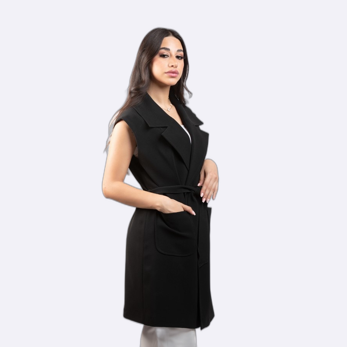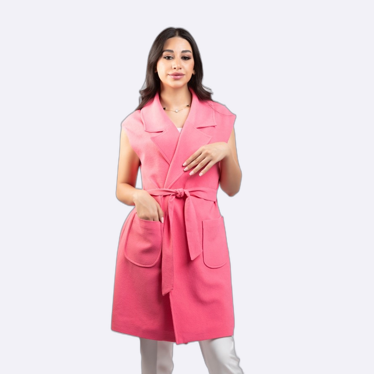 فيست طويل بدون أكمام يتميز بياقة عريضة وحزام خصر قابل للربط مع جيوب أمامية واسعة