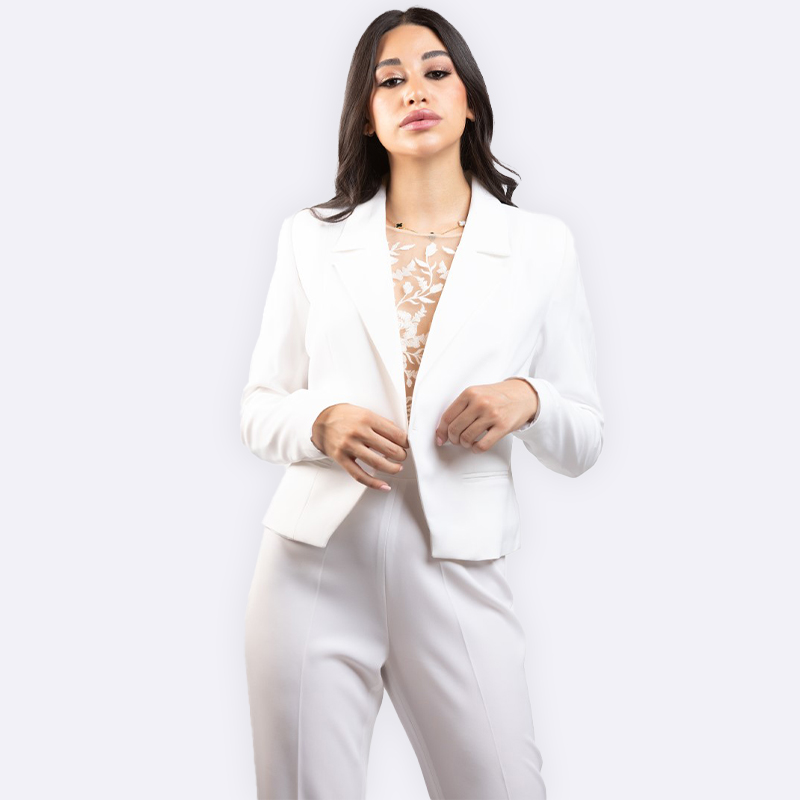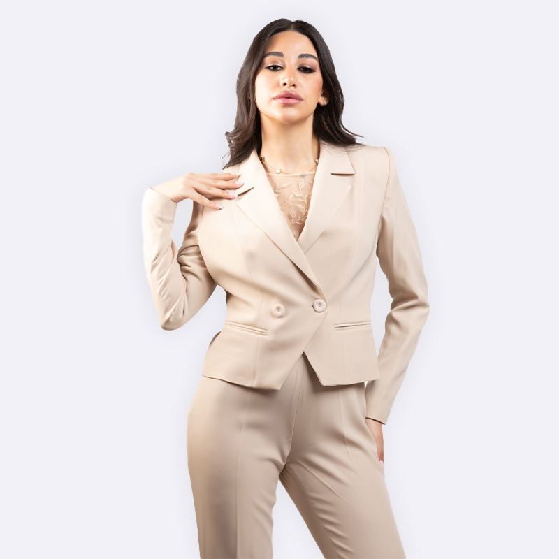 بليزر قصير بياقة مدببة يتميز بأزرار أمامية مزدوجة وجيوب جانبية مخفية