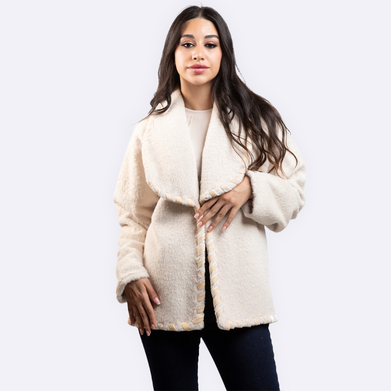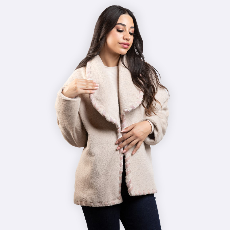 كارديجان ناعم يتميز بياقة عريضة وتفاصيل غرز تطريز يدوية على الحواف بتصميم مريح