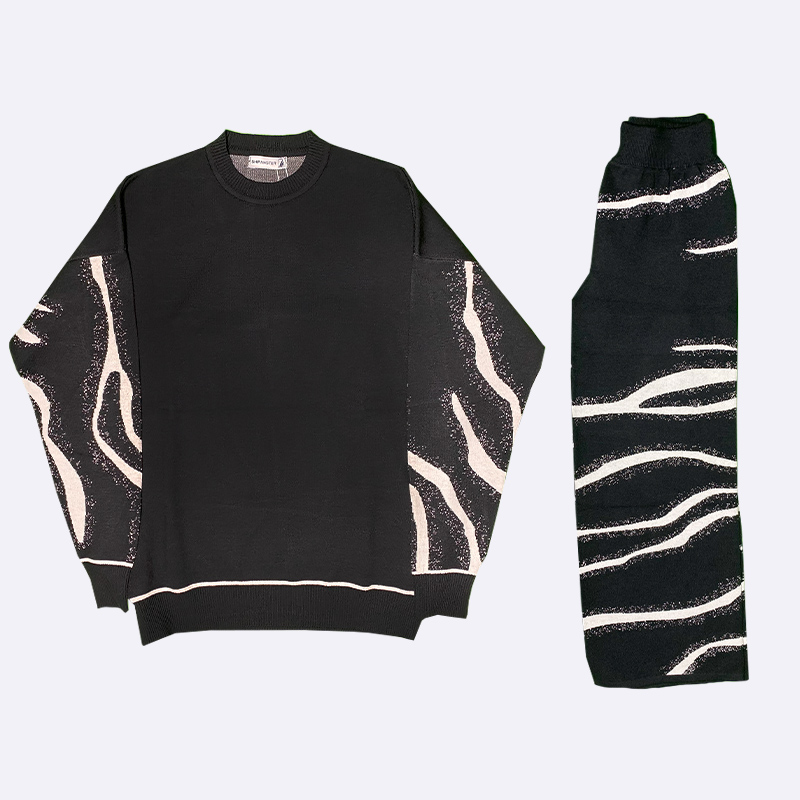 استمتعي بأناقة لا مثيل لها مع طقم الاستراحة التريكو بنقشة الأمواج. تصميم عصري ومريح يمنحك إطلالة جذابة ومميزة في كل مكان.