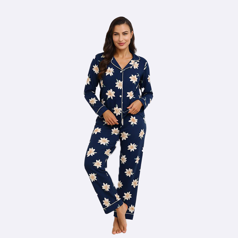 طقم بيجاما مريح بأكمام طويلة وطبعة زهور، يتميز بقميص مزود بأزرار وبنطلون طويل، ومزين بحواف متباينة، مثالي للارتداء المنزلي.