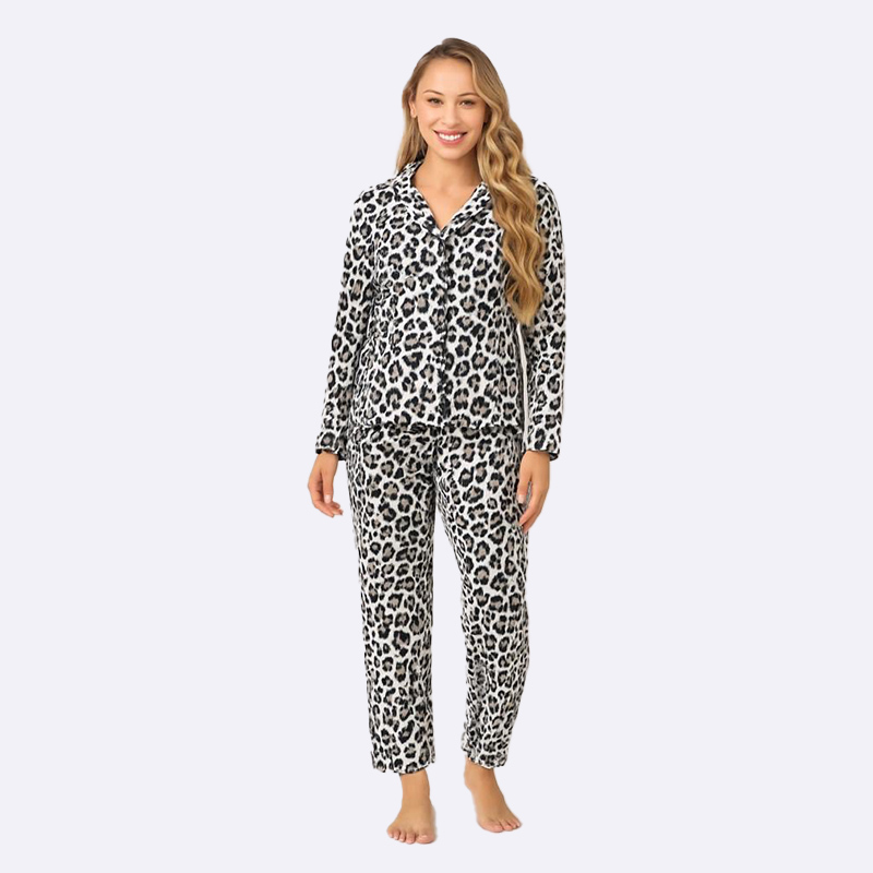 طقم بيجاما مريح بأكمام طويلة وطبعة حيوانات (ليوبارد)، يتميز بقميص مزود بأزرار وبنطلون طويل، مثالي للارتداء المنزلي.