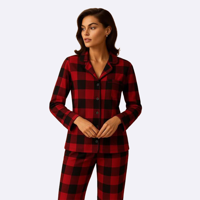 طقم بيجاما شتوي مريح بأكمام طويلة وطبعة المربعات (Plaid)، مصنوع من نسيج الفلانيل الدافئ، يتميز بقميص بأزرار وبنطلون طويل، مثالي للراحة في الليالي الباردة.