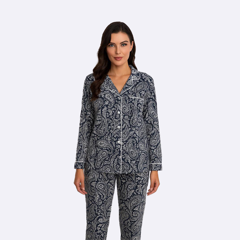 طقم بيجاما مريح بأكمام طويلة وطبعة بيزلي (Paisley)، يتميز بقميص مزود بأزرار وبنطلون طويل، ومزين بحواف متباينة، مثالي للارتداء المنزلي.